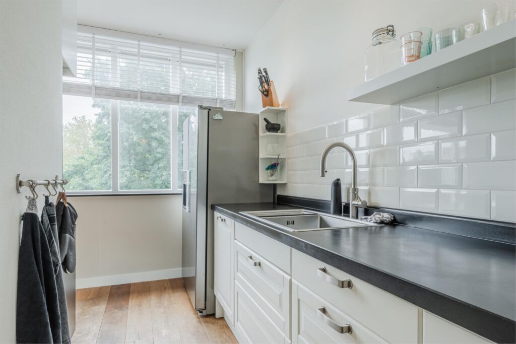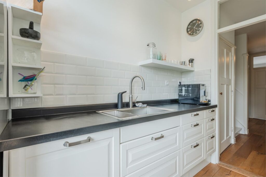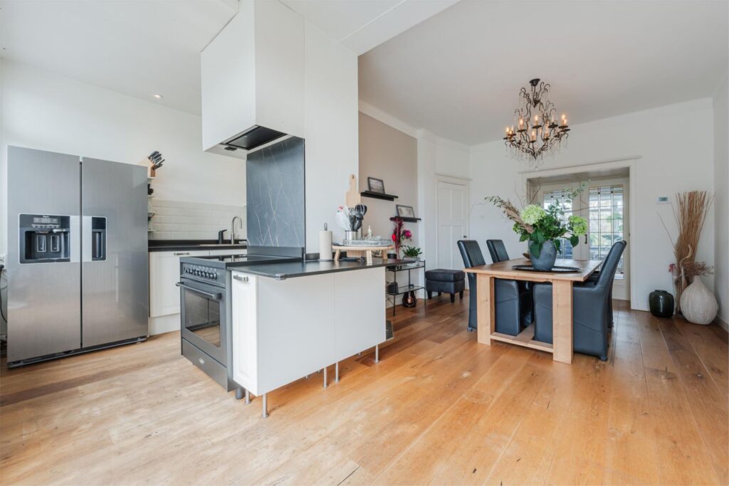 De moderne open keuken (ca. 3,60 x 1,52 m) is van alle gemakken voorzien: Boretti-inductie kookunit, Amerikaanse koelkast, Quooker, vaatwasser en volop kastruimte.