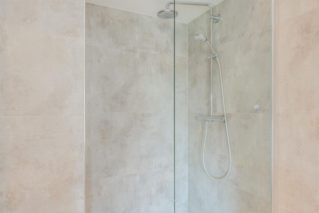 Slaapkamer met moderne inloopdouche en wastafelmeubel.