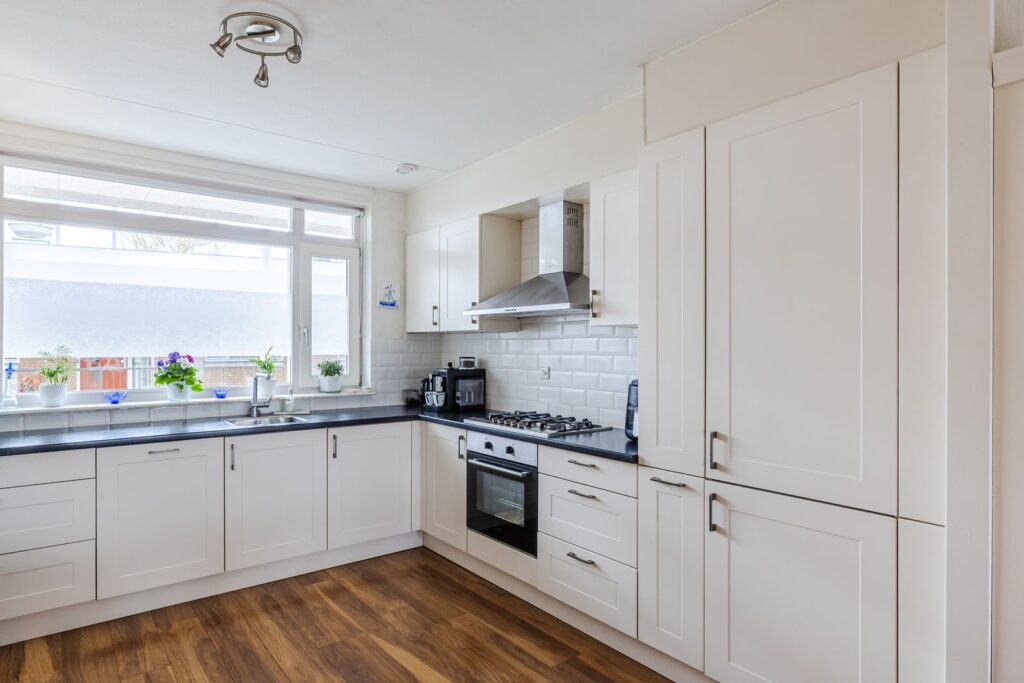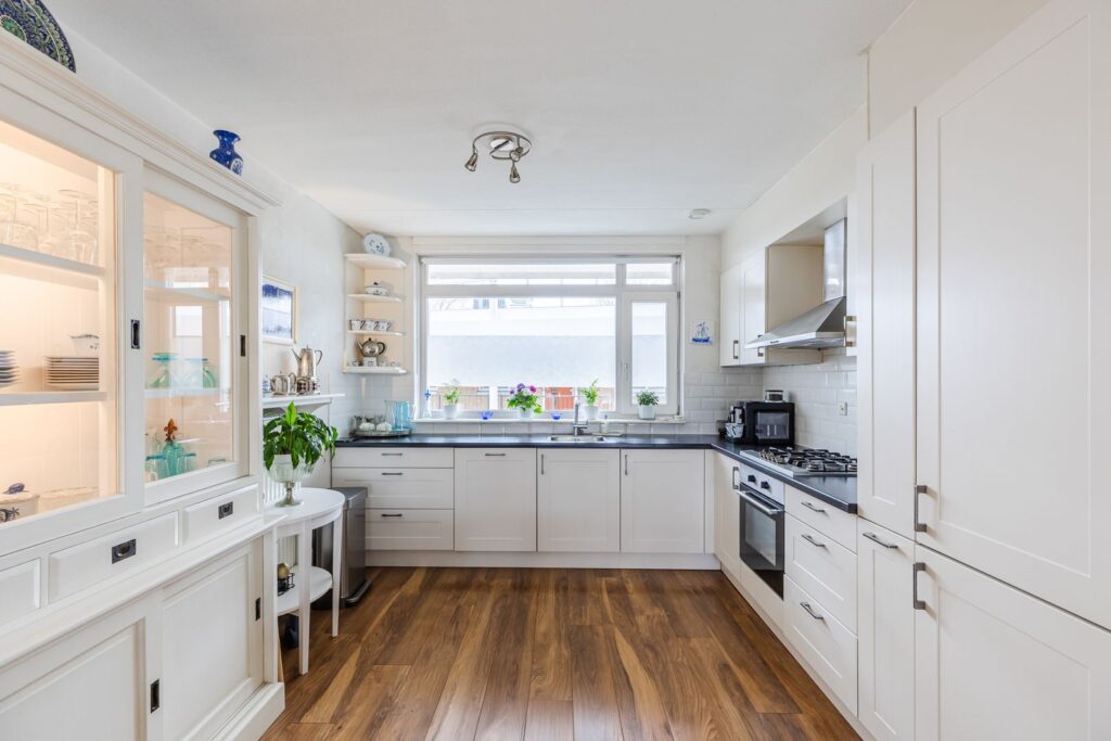 *Aansluitend aan de kamer ligt de open keuken met o.a. een kookplaat, oven, RVS-afzuigschouw, spoelbak, vaatwasmachine, een koel-/vrieskast, ook zit hier een handige apothekerskast in.