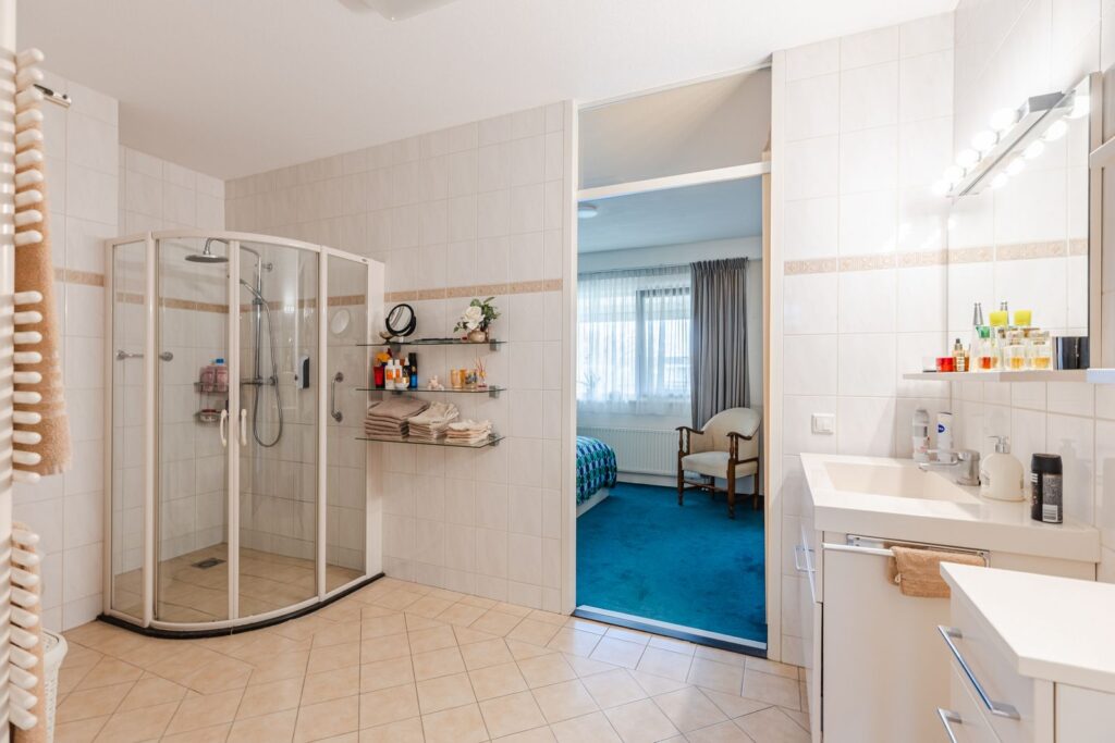 De badkamer is comfortabel en compleet met toilet, ruime douche, wastafel met planchet, spiegel en ventilatie.