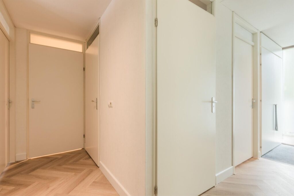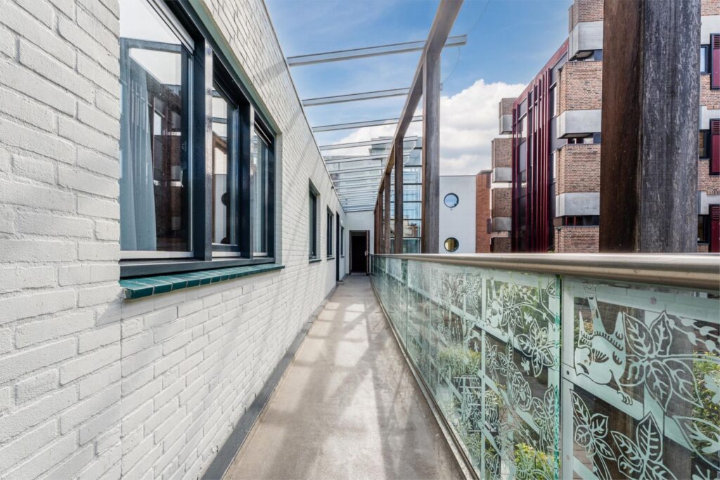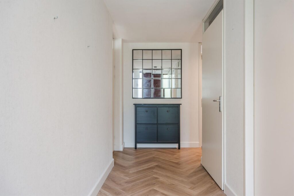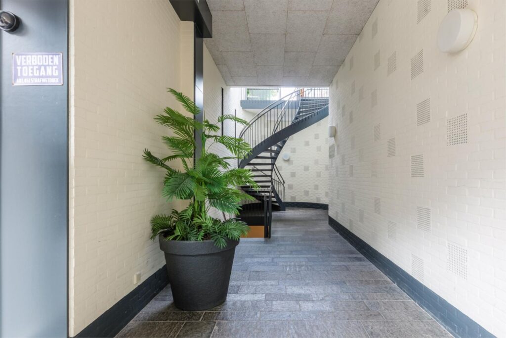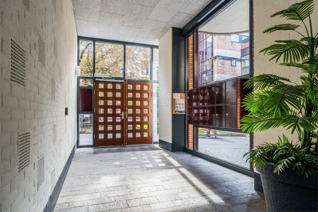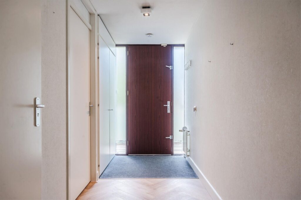 Bij aankomst zie je de centrale voordeur naast het gemeentehuis, compleet met bellentableau, videofoon en brievenbussen. Eenmaal binnen, neem je de trap of lift naar de tweede verdieping en loop je over de half open galerij naar het appartement. Bij binnenkomst biedt de gang toegang tot alle vertrekken.