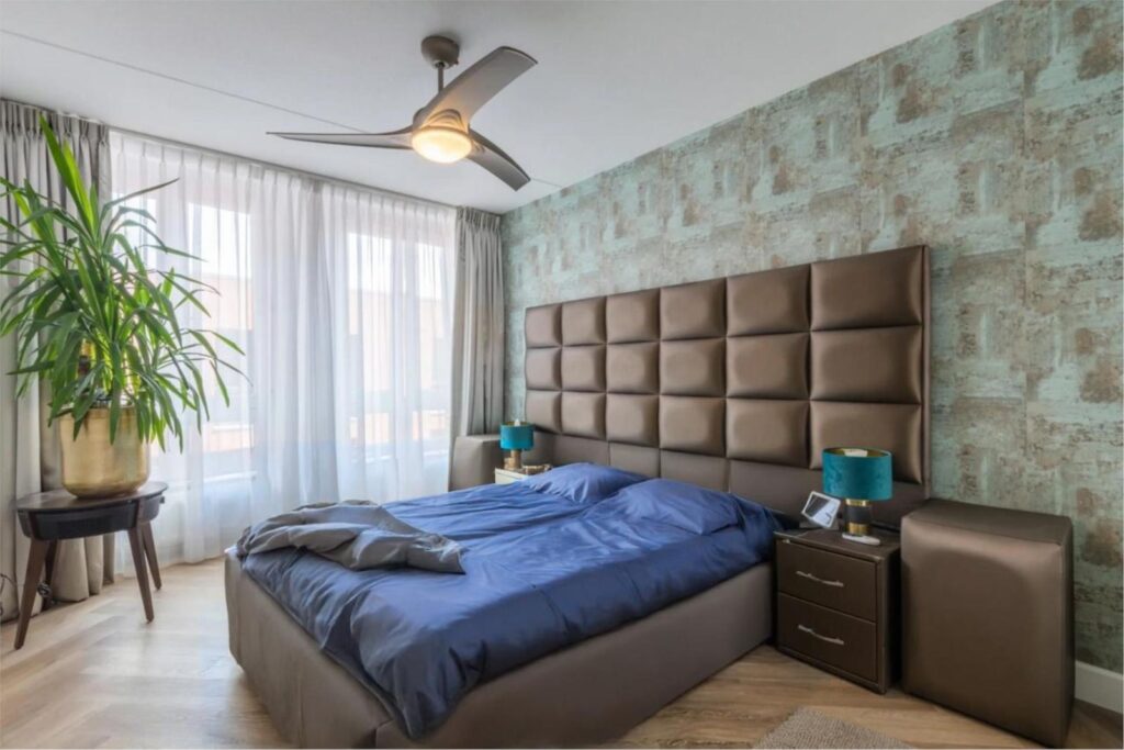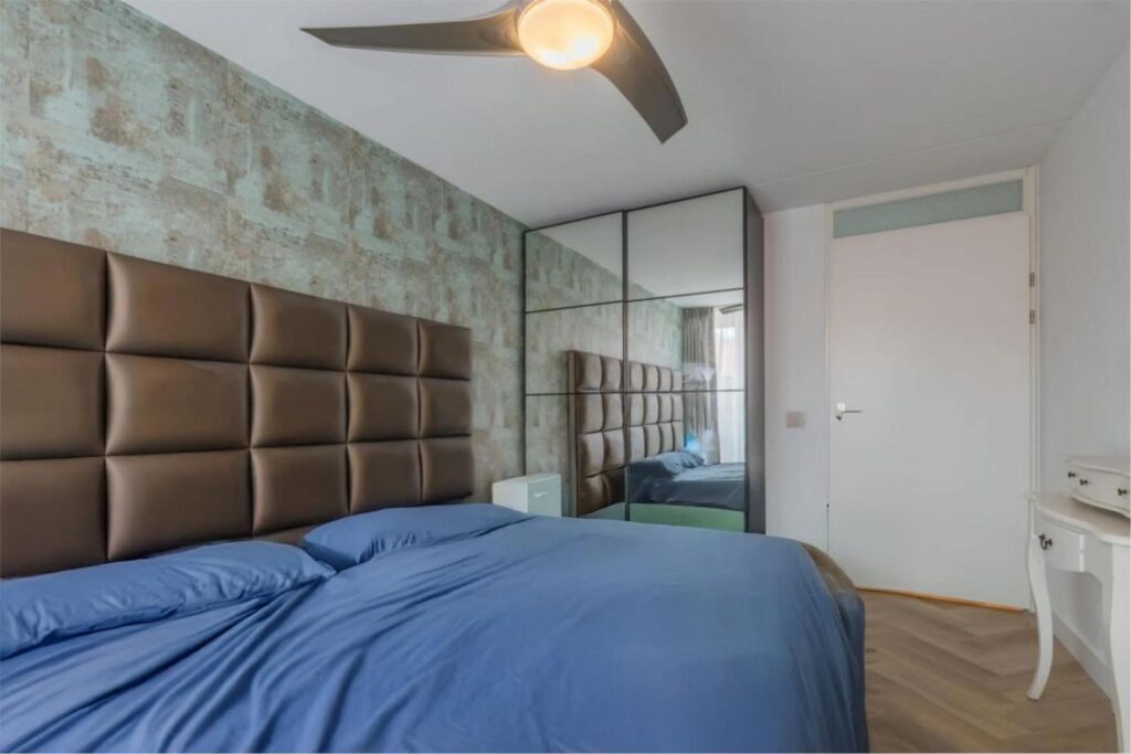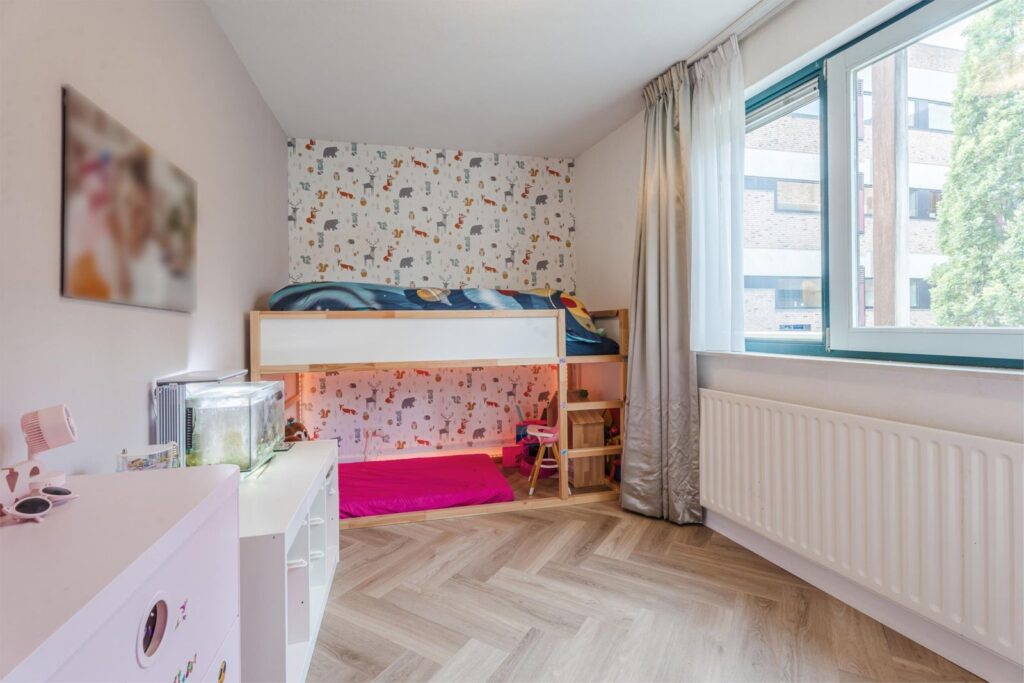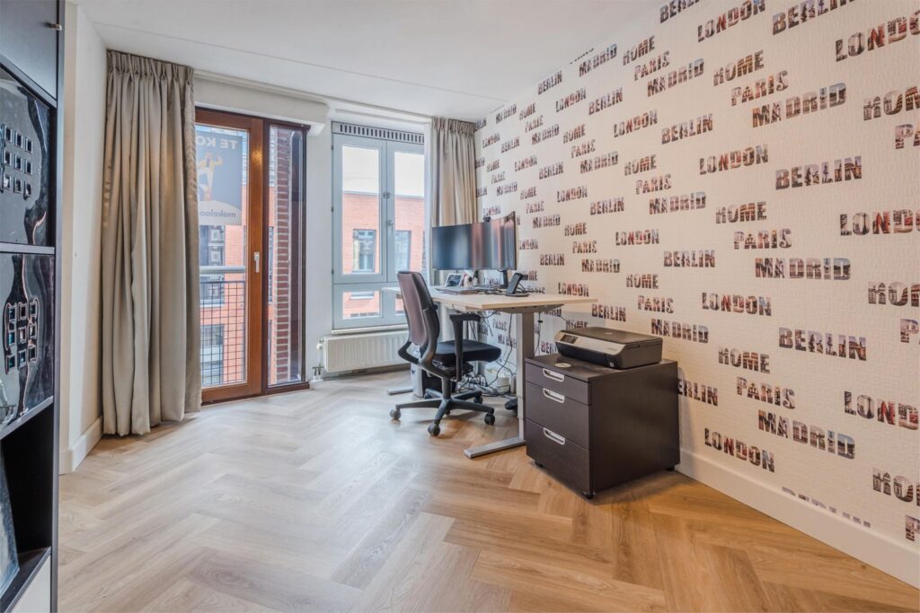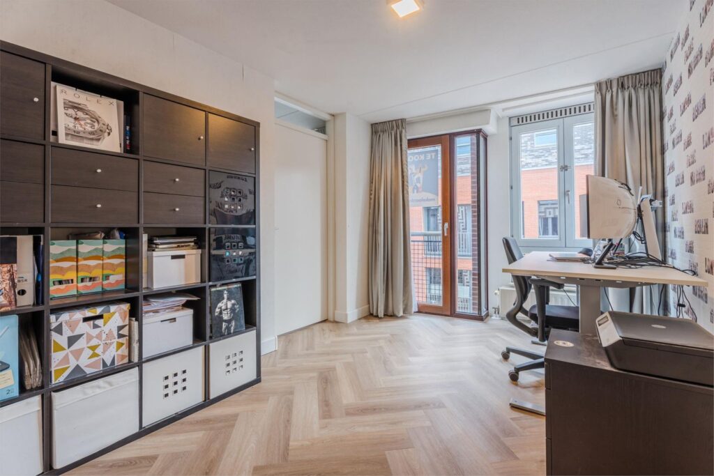 Aan de voorzijde van het appartement liggen twee ruime slaapkamers. De lage raampartijen met Frans balkon zorgen voor veel daglicht en een fijn contact met buiten. De laatste deur in de gang brengt je naar de ruime, ruime woonkamer met een openkeuken voorzien van een bartafel, eveneens met fraaie raampartijen en een Frans balkon. De aangrenzende slaapkamer is ook toegankelijk vanuit de woonkamer en dient nu als een fijne werkplek . Het biedt in ieder geval wat extra flexibiliteit.