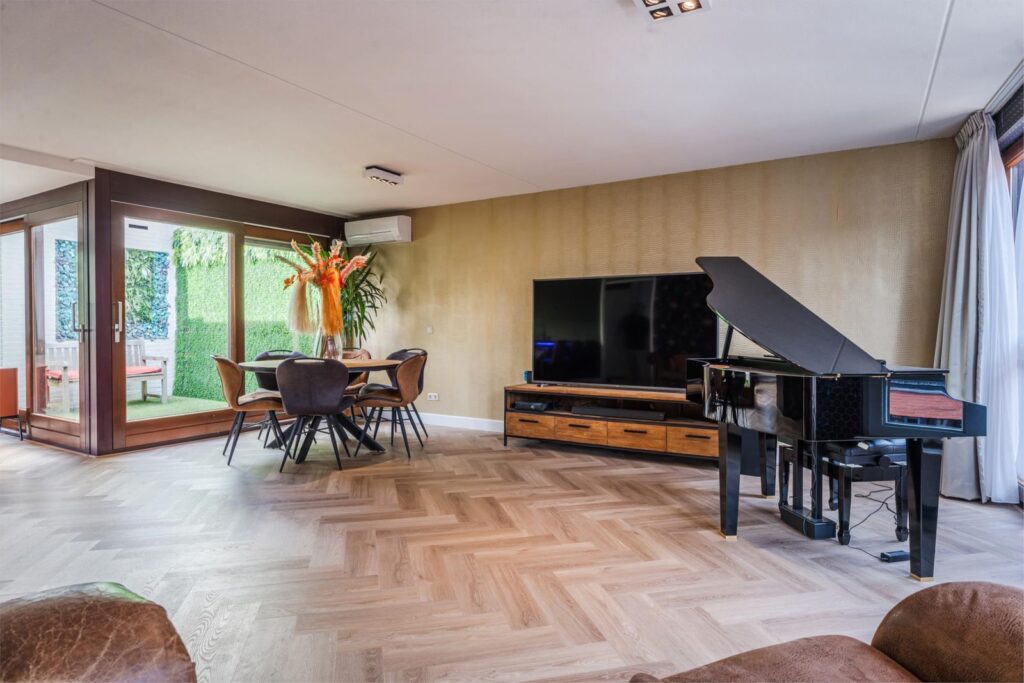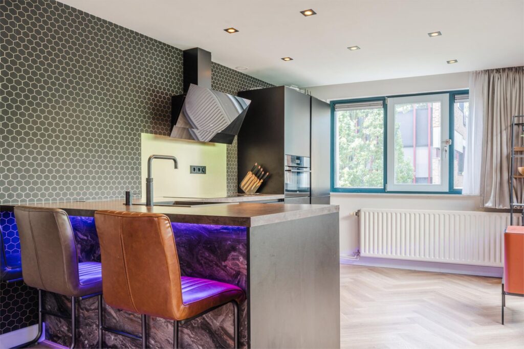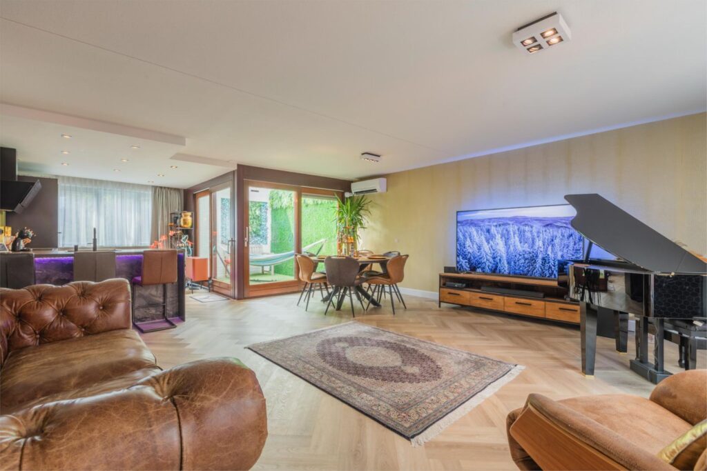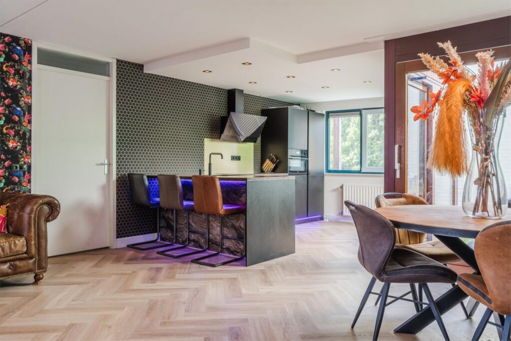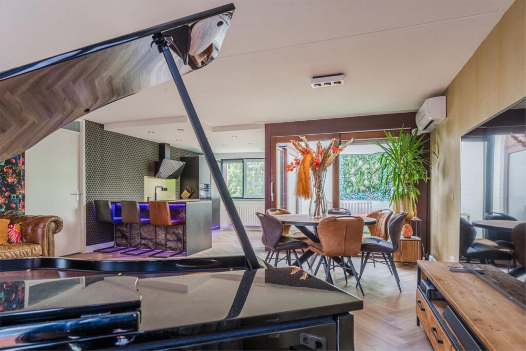 De open keuken, compleet met een barretje en drie barstoelen, biedt alle moderne gemakken en straalt pure gezelligheid uit. Alle keukenapparatuur is van het merk AEG, en in een moderne keuken mag een Quooker natuurlijk niet ontbreken. Vanuit de keuken loop je zo de groene oase van de patio in, die via een schuifpui ook vanuit de woonkamer bereikbaar is. Deze westelijk gelegen patio biedt ultieme privacy en een uitnodigende, gezellige sfeer.
