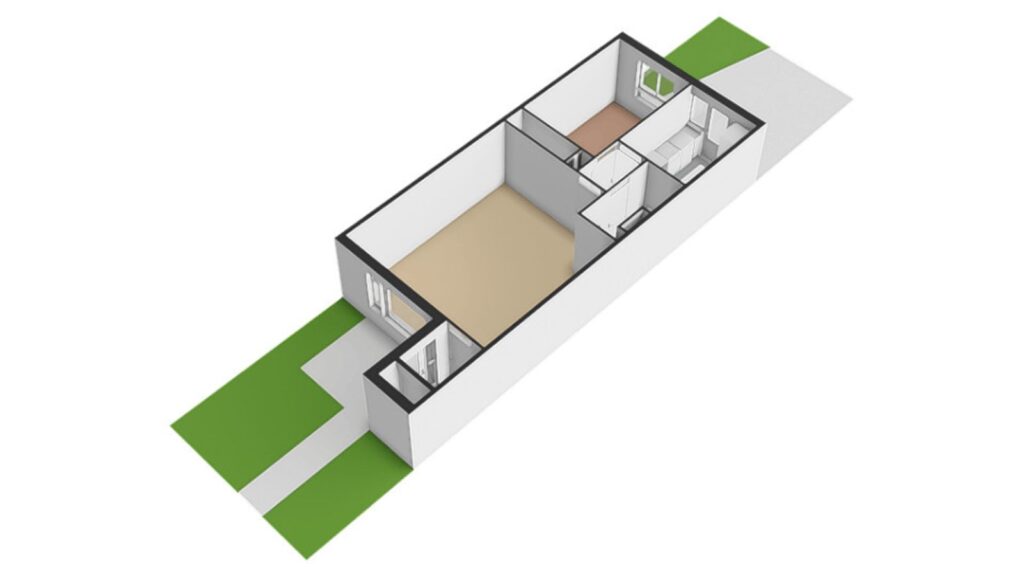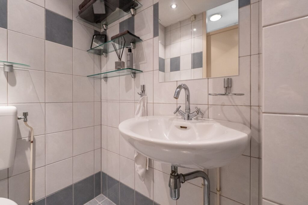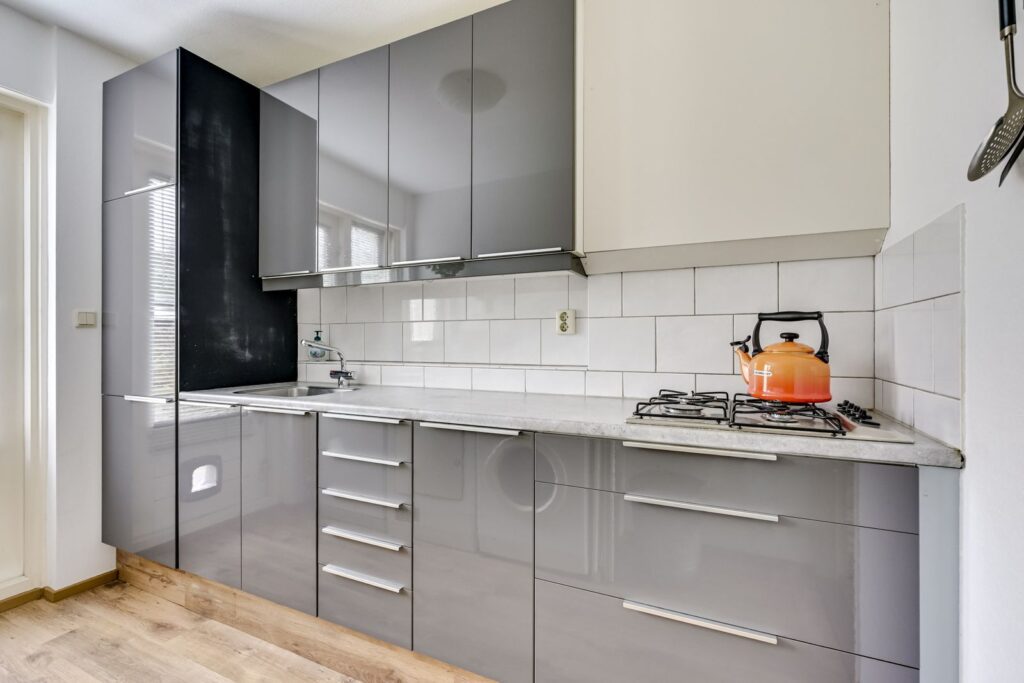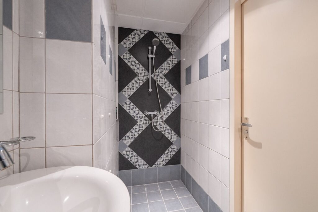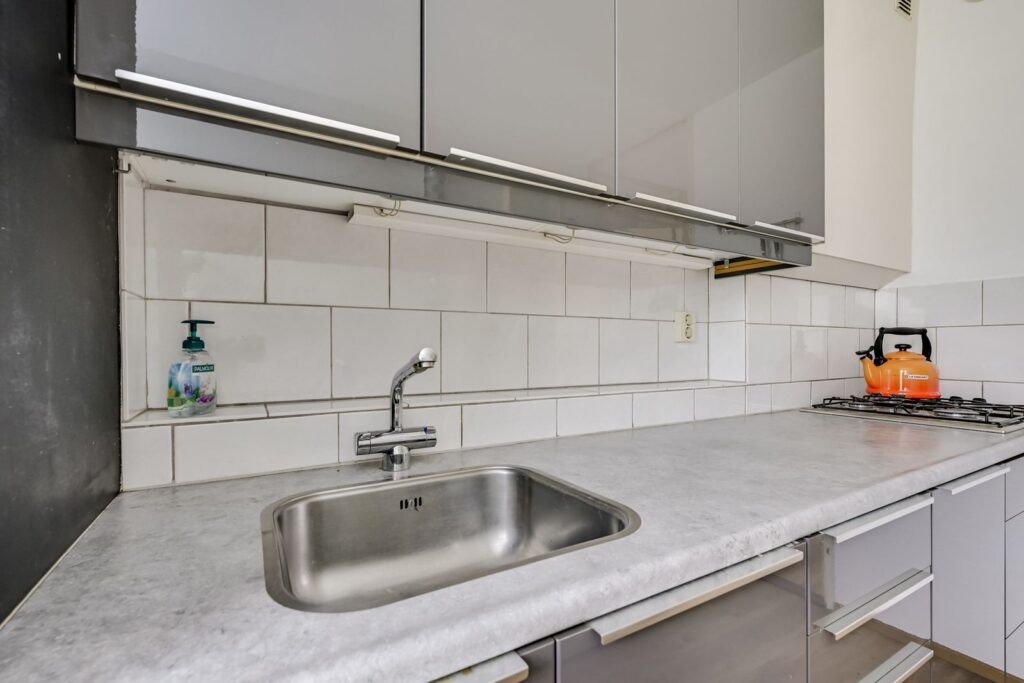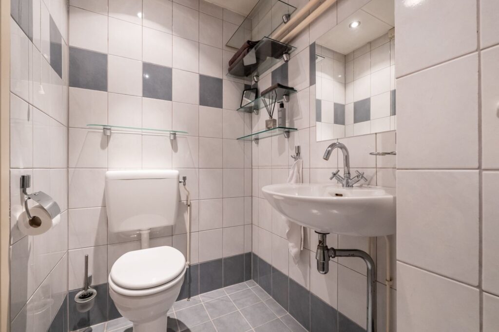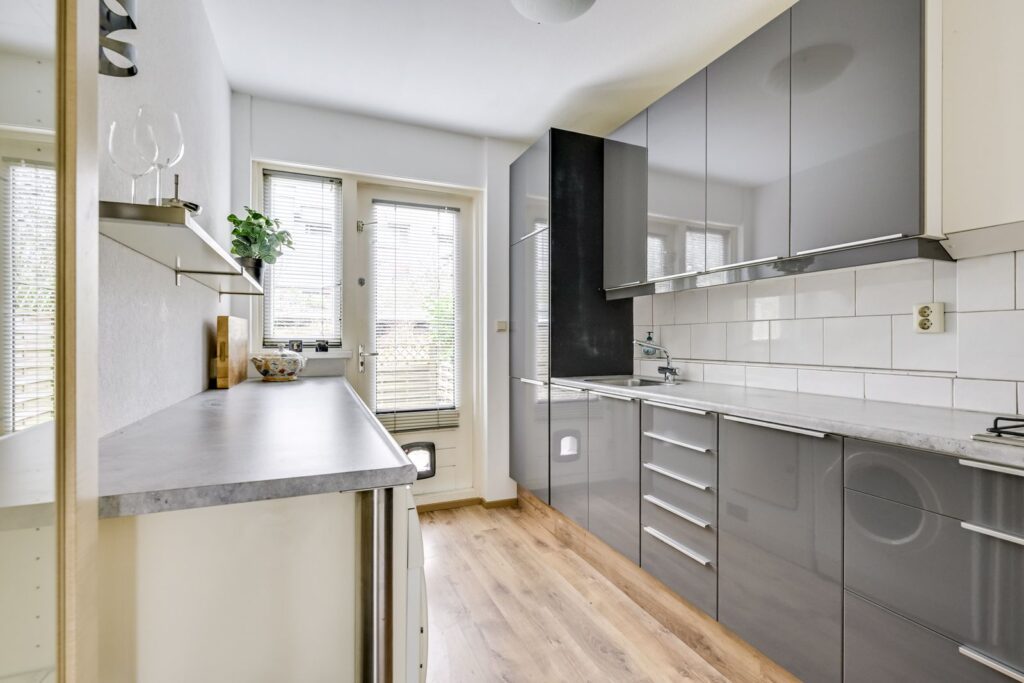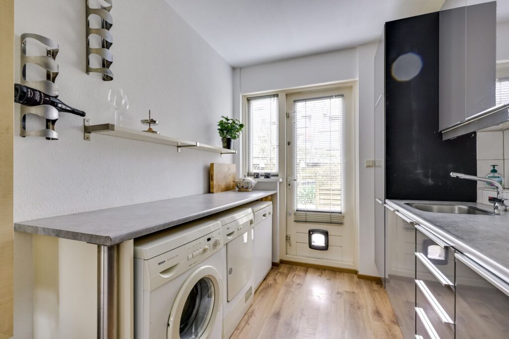 De dichte keuken bevindt zich eveneens aan de achterzijde. Deze is uitgevoerd in een grijze opstelling met veel kastruimte en een lang werkblad aan beide zijden. De lichte wandtegels zorgen voor een verzorgde uitstraling. Hier vind je ook de aansluiting voor wasmachine en droger. Via de deur stap je zo de achtertuin in ideaal op zonnige dagen of om even snel een frisse neus te halen. De badkamer is volledig betegeld in een neutrale wit-grijze kleurstelling en beschikt over een douche, toilet en wastafel. Compact, maar compleet en functioneel ingericht.
