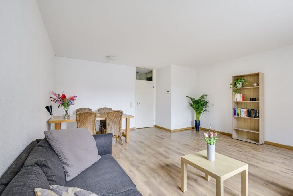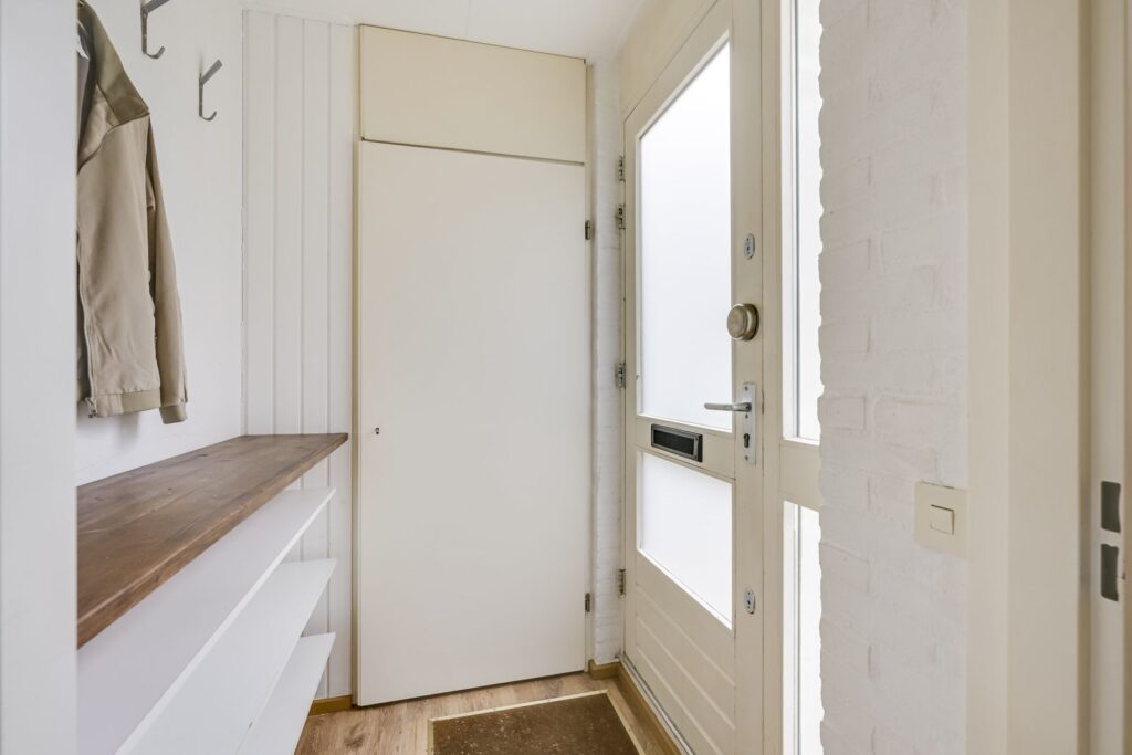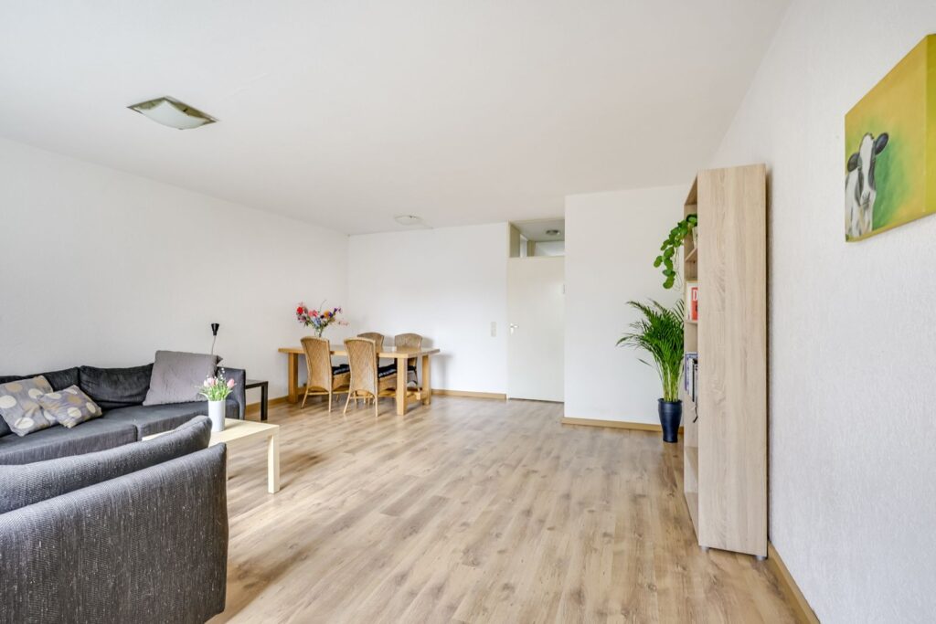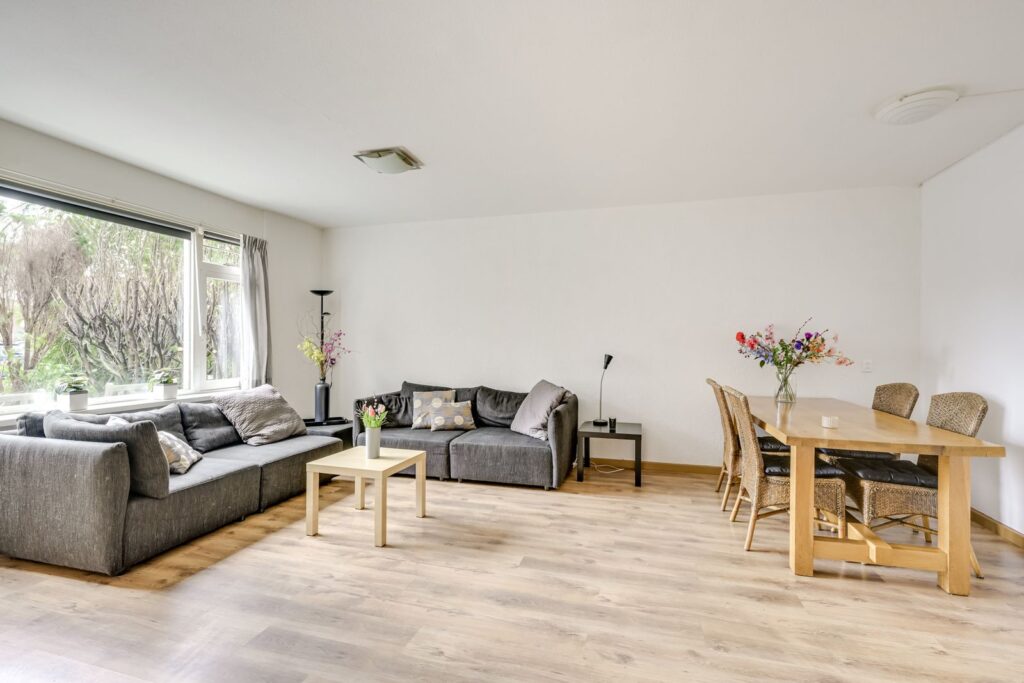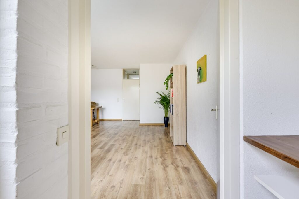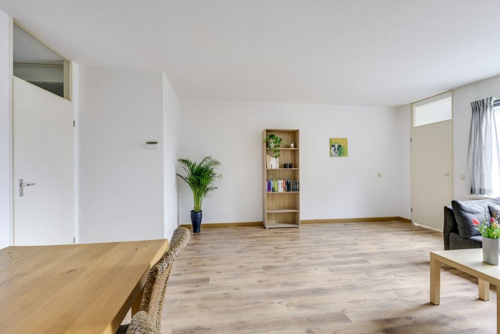 Via de voortuin kom je binnen in de entree met praktische vaste kast handig voor jassen, schoenen en extra opslag. Vanuit hier loop je door naar de ruime woonkamer. De woonkamer is opvallend breed en heerlijk licht dankzij de grote raampartij aan de voorzijde. Het vrije zicht van voor naar achter geeft de ruimte een open en ruimtelijk gevoel. De lichte laminaatvloer en strakke witte wanden vormen een neutrale basis waar je gemakkelijk je eigen stijl aan geeft. Er is volop plek voor een comfortabele zithoek én een royale eettafel.