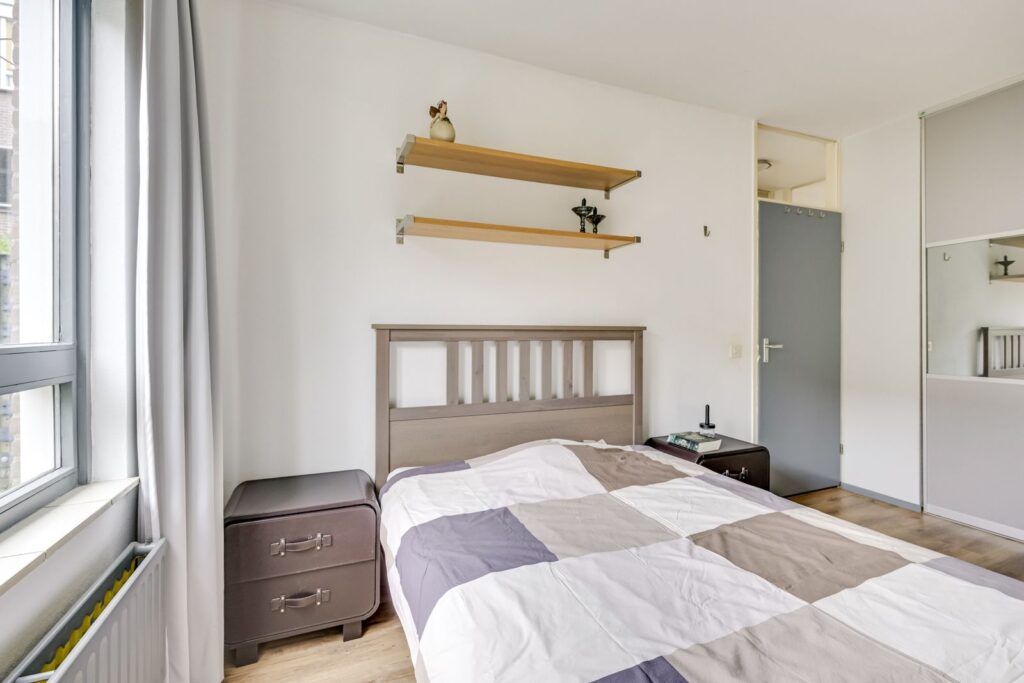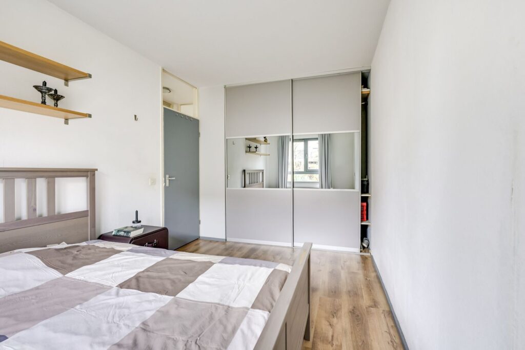 Aan de achterzijde van de woning ligt de slaapkamer, rustig aan de tuinzijde. Dankzij het grote raam met uitzicht op het groen komt er prettig daglicht binnen en voelt de kamer fris en licht aan. De ruimte is efficiënt ingedeeld en biedt voldoende plek voor een tweepersoonsbed en nachtkastjes. De grote inbouwkast met schuifdeuren zorgt voor volop opbergruimte, waardoor je de kamer strak en rustig kunt houden.