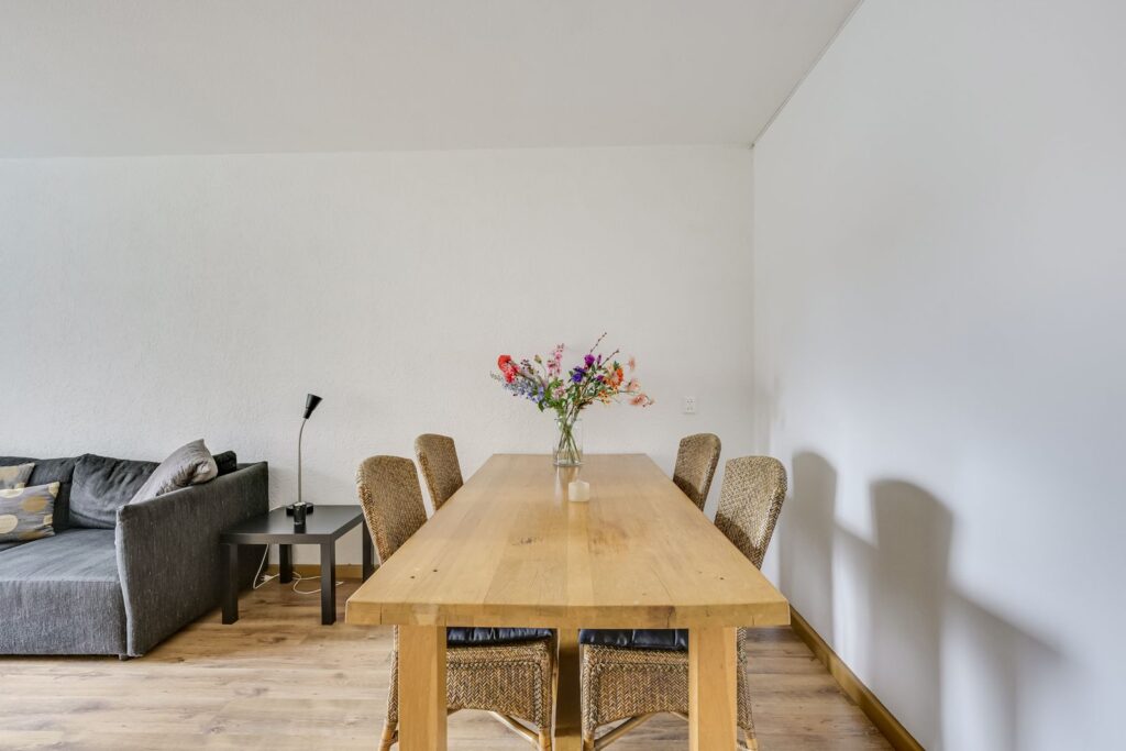 Through the front garden, you enter the entrance hall with a practical built-in closet, perfect for coats, shoes, and extra storage. From here, you walk into the spacious living room. The living room is remarkably wide and wonderfully bright thanks to the large windows at the front. The unobstructed view from front to back gives the room an open and spacious feel. The light laminate flooring and sleek white walls provide a neutral base that's easy to personalize. There's plenty of room for a comfortable seating area and a large dining table.