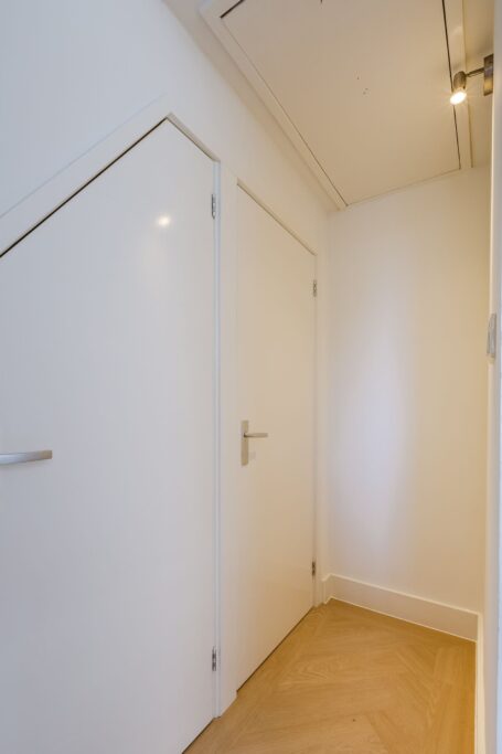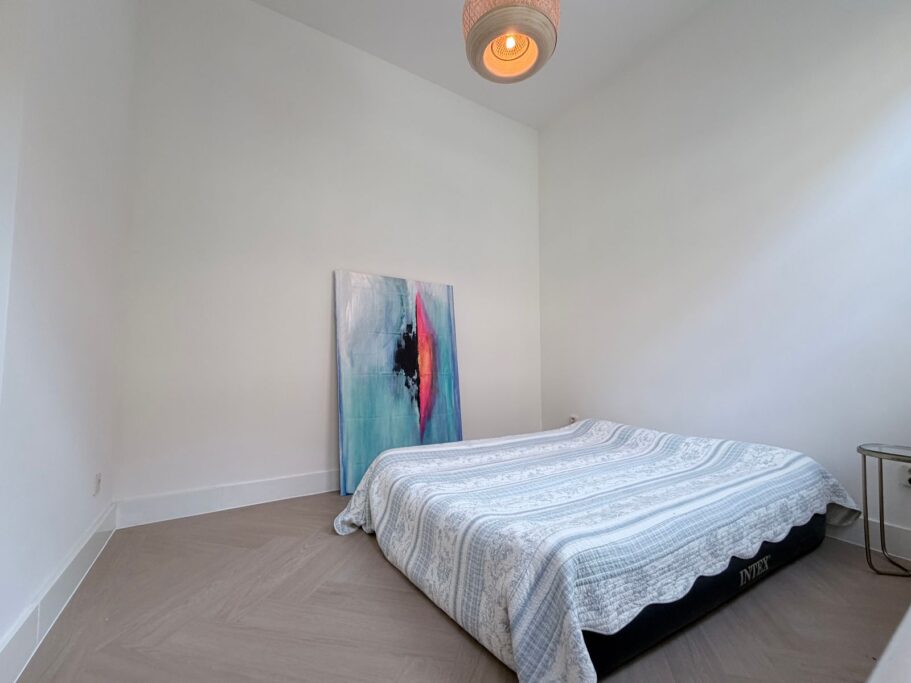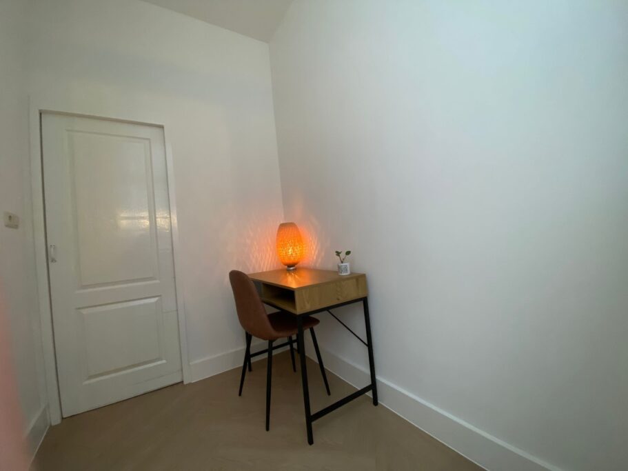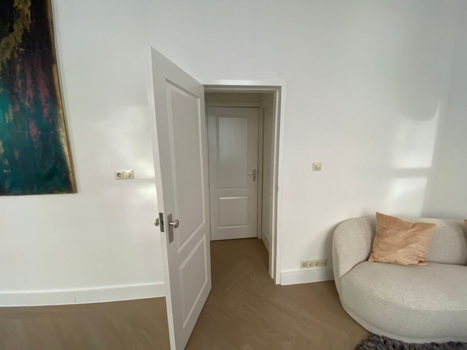 De woon-/eetkamer biedt voldoende ruimte, omdat de grote slaapkamer (±10m²) is uitgebouwd. Er is ook een kleine slaap- of werkkamer, met houten kozijn en deur naar het kleine terras (±7 m²). In deze kamer bevindt zich een smalle kast met CV-ketel (2018).
