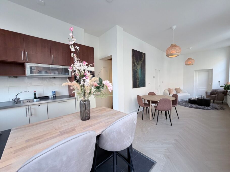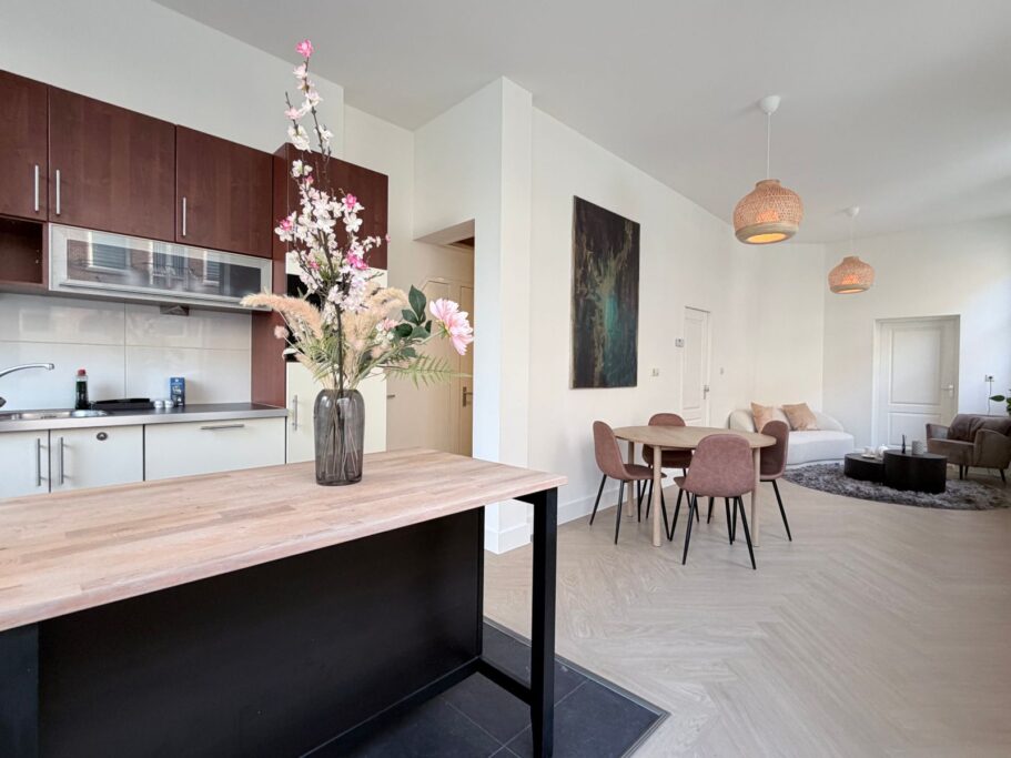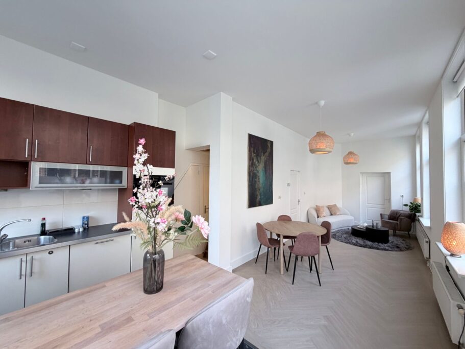 Via de eigen entree op de begane grond komt u in dit fijne appartement. Door de kleine open hal gaat u naar de woonkamer met open keuken. Het hele appartement heeft hoge plafonds (±3.20 m) en hoge ramen, waardoor het erg licht is. De kozijnen zijn van kunststof en voorzien van dubbel glas.