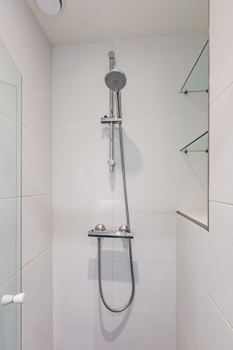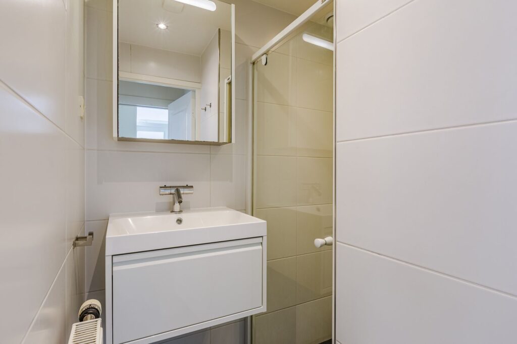 De badkamer bevindt zich in het midden en heeft een douche en wastafelmeubel. Het toilet is separaat. Beide zijn bereikbaar via een deur in de woonkamer en voorzien van een nieuwe centrale afzuiging met afstandsbediening en vochtcensor.