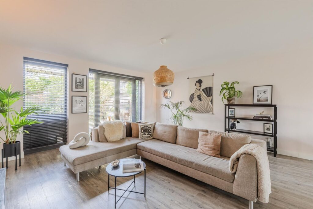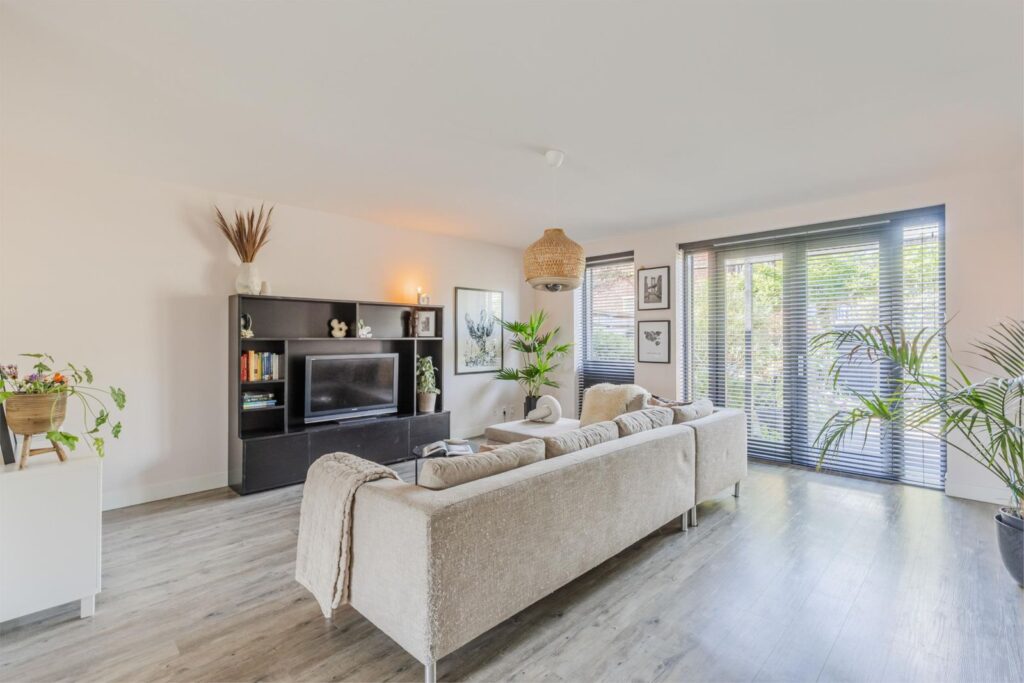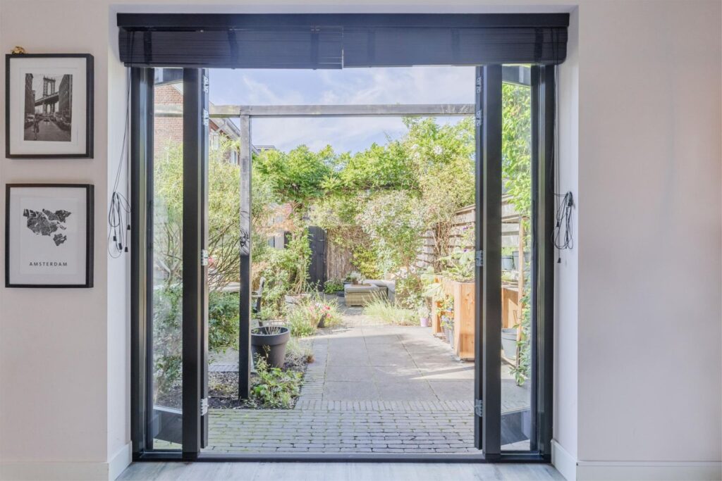 De entree leidt naar een verzorgde hal met een modern toilet, een eigentijdse meterkast en een ruime, afgesloten berging. Aan de achterzijde van de woning bevindt zich de royale woonkamer, die direct in het oog springt dankzij de dubbele tuindeuren met zicht op de onder architectuur aangelegde tuin. Deze deuren zorgen voor een naadloze verbinding tussen binnen en buiten en zijn uitgerust met elektrisch bedienbare rolluiken voor extra comfort en veiligheid.