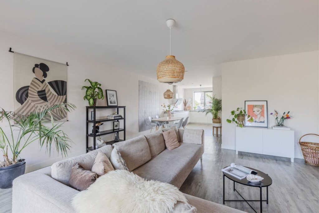 De begane grond is afgewerkt met een duurzame PVC-vloer in een moderne, neutrale kleur, waarbij de vloerverwarming zorgt voor een aangename temperatuur. De bamboe lamellen aan de achterzijde zorgen voor een warme en natuurlijke uitstraling.