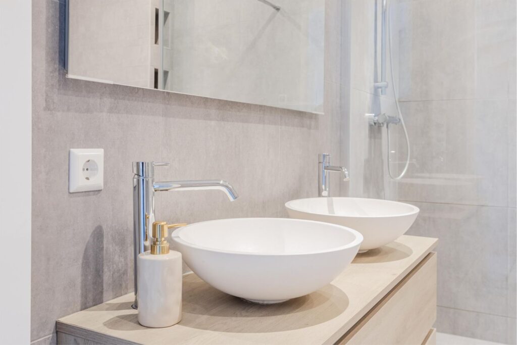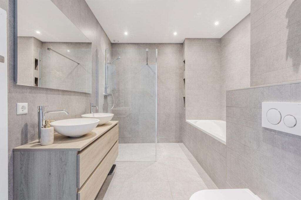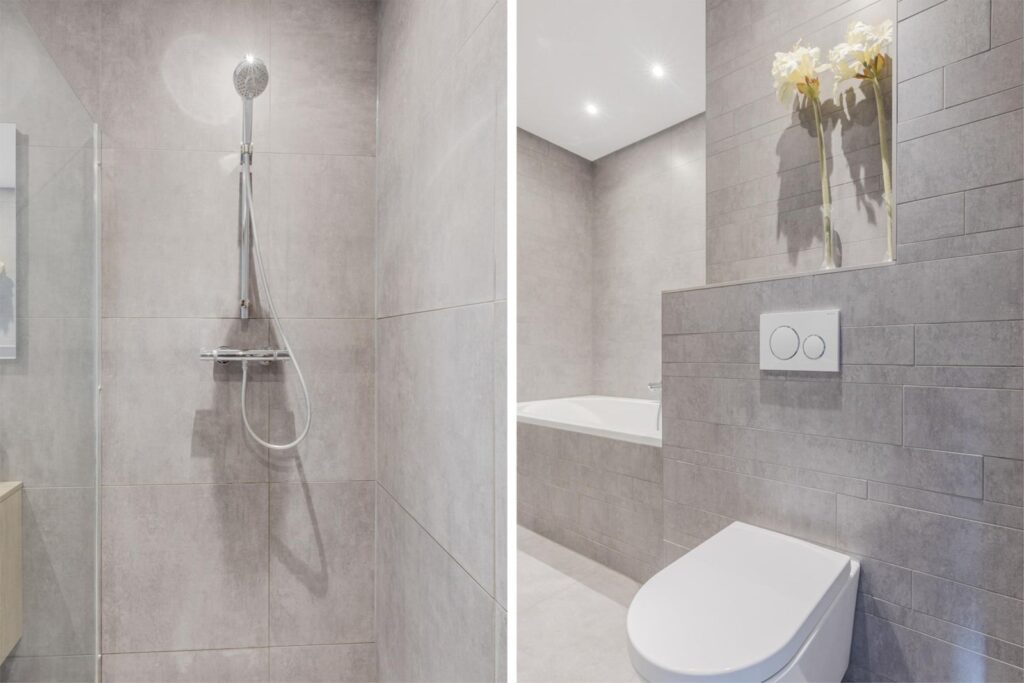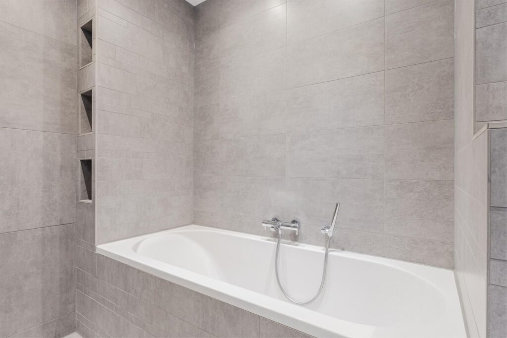 De luxe badkamer is tot in detail afgewerkt met hoogwaardige materialen, volledig betegeld en voorzien van een vrijstaand toilet, dubbele wastafel met meubel, comfortabele ruime inloopdouche en een heerlijk ligbad. Het verlaagde plafond met inbouwspots zorgt voor een stijlvolle, hotelwaardige sfeer.
