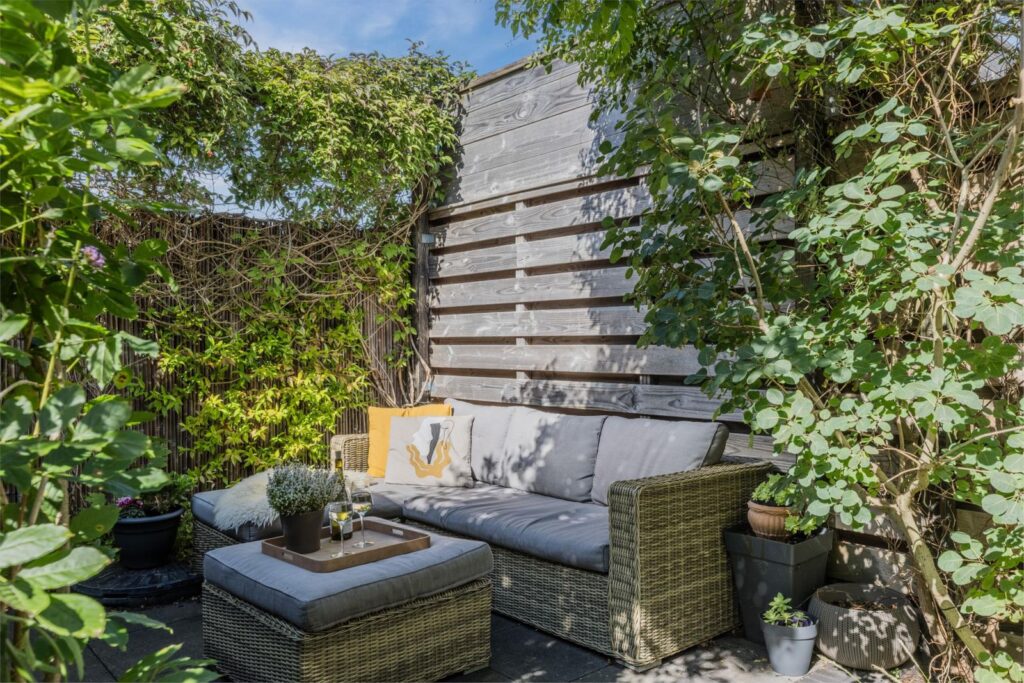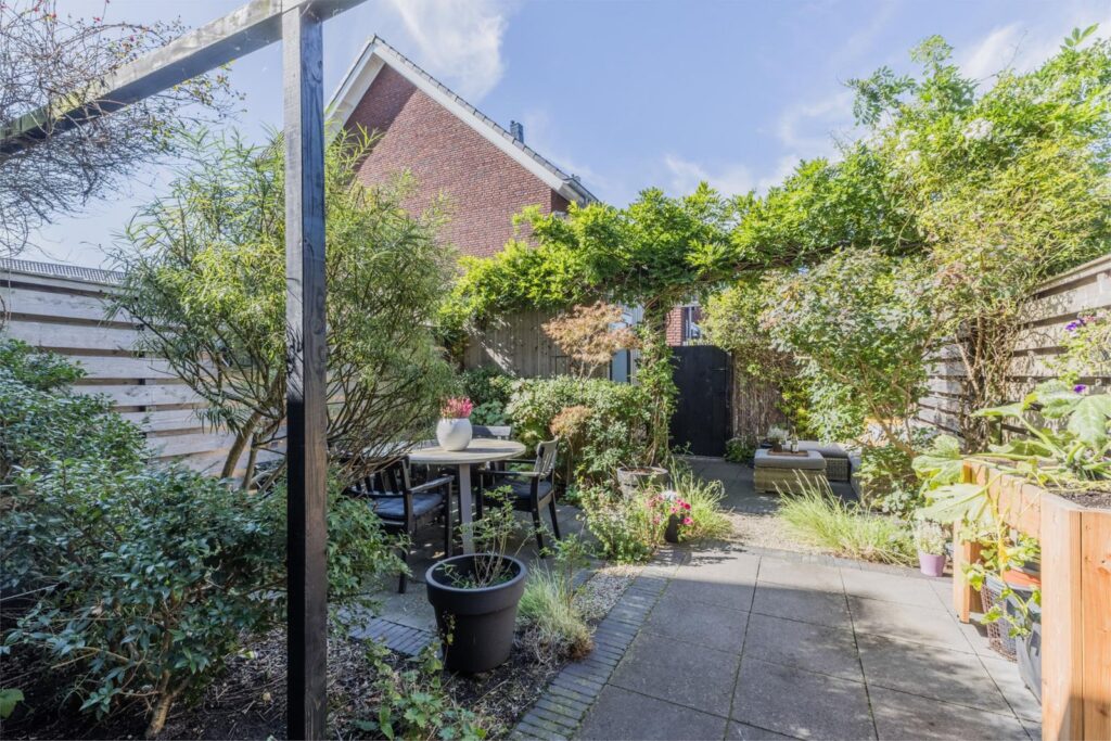 De onder architectuur aangelegde achtertuin op het westen is een groene oase, waar elk seizoen iets in bloei staat. Van kleurrijke voorjaarsbollen tot wintergroene accenten – deze tuin, met verschillende terrassen, is het hele jaar door een plek om van te genieten. Of je nu graag tuiniert of juist tot rust komt met een boek en uitzicht op het water, in deze woning kan het allemaal. Praktisch gemak wordt versterkt door de aanwezigheid van een achterom, buitenberging en elektra aan zowel de voor- als achterzijde. Daarnaast is er aan de achterzijde een buitenkraan.