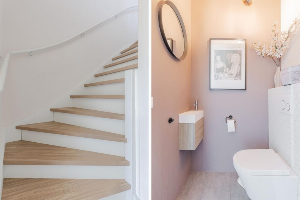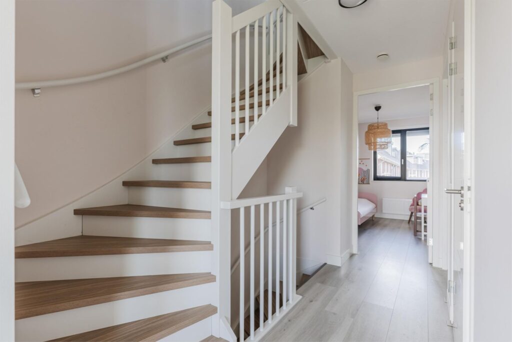 De trap naar de eerste verdieping is een echte blikvanger dankzij de houtlook afwerking en dichte treden – mooi én praktisch, met een antislip-laag en krasvaste toplaag.