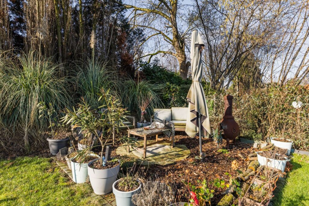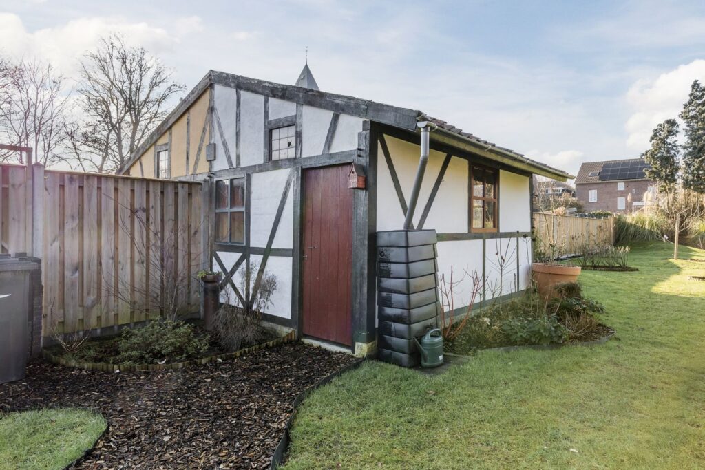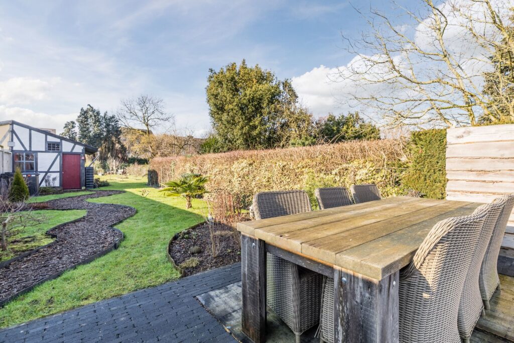 Aan de achterzijde van de tuin bevind zich een boomgaard, voorzien van diverse fruitbomen en bloemperken. Tevens is er een vakwerk tuinhuis, royaal gazon en zijn er diverse terrassen te vinden. Via het woonhuis heeft u toegang tot de patio, aangelegd in 2025, voorzien van een pergola en toegang tot de hoger gelegen tuin.