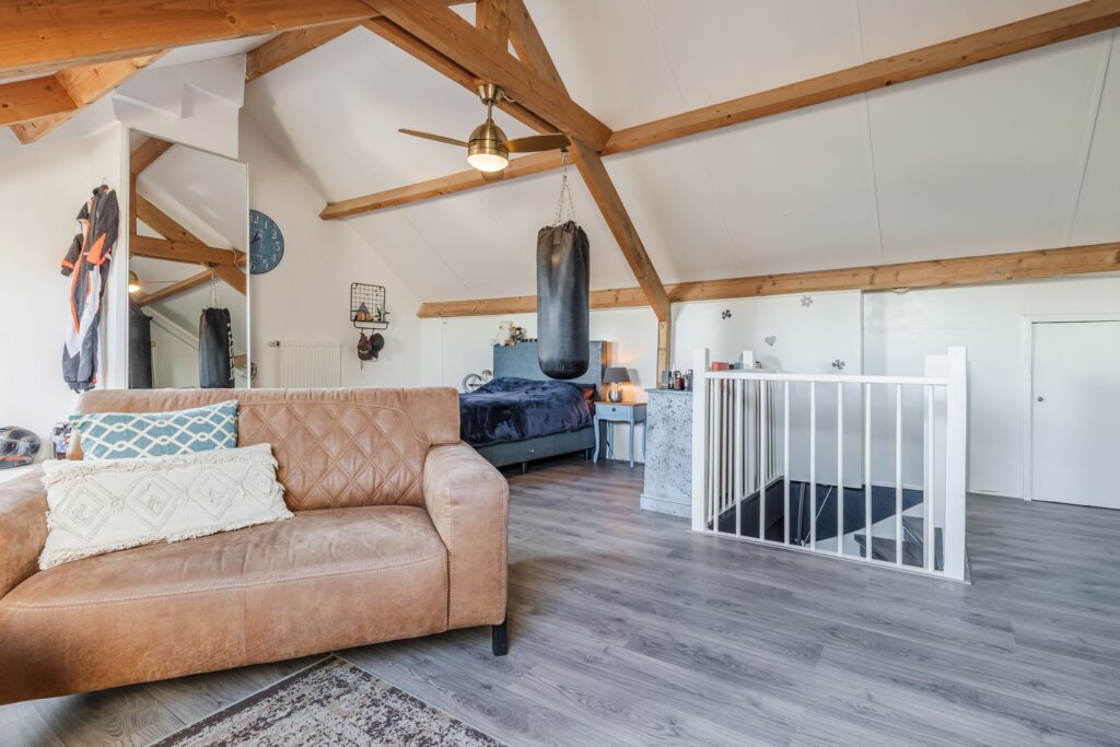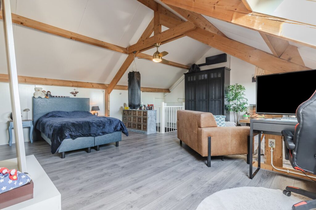 Middels vaste trap vanaf de eerste verdieping toegang tot een riante geïsoleerde zolderverdieping (slaapkamer 6) met veel opbergruimte, technische ruimte, twee Velux dakramen en verwarmt door radiatoren en een airco.