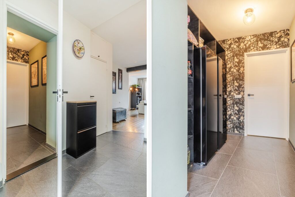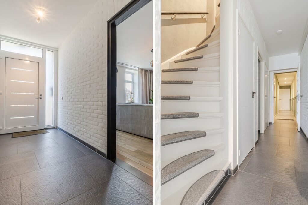 Lange ontvangsthal met vernieuwde meterkast (2025) voorzien van 17 groepen. Toegang tot het toilet (2024) en deur naar de woonkamer.Trap naar de eerste verdieping, garderobe en deur naar de kelder.