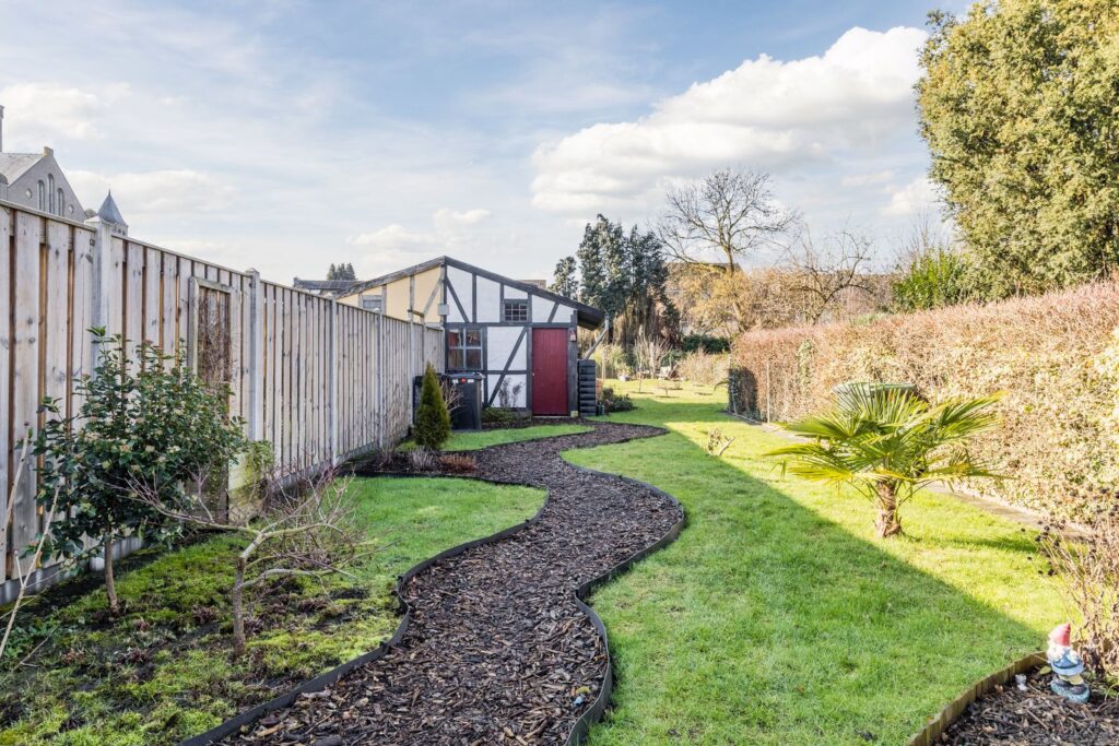 De omsloten achtertuin van ca. 50 meter diep en ca. 10 meter breed ligt op het zuidwesten. Aan de ene zijde is de tuin omsloten door heggen, aan de andere zijde door schuttingen (2025).