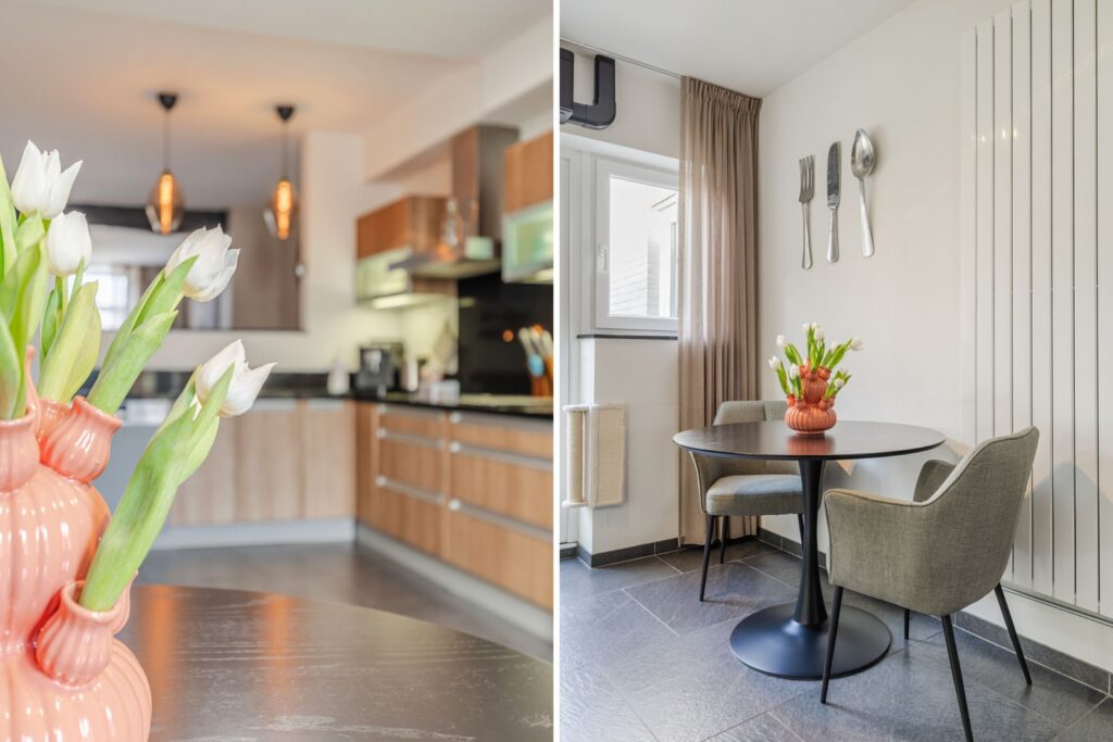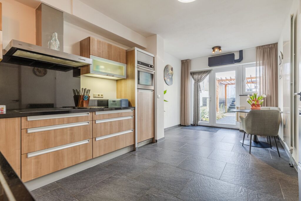 De royale woonkamer is voorzien van een eikenhouten parketvloer, houtkachel en een lage temperatuurradiator. De woonkamer is opgedeeld in een ruim zit- en eetgedeelte en staat in verbinding met de keuken. Deze is voorzien van inbouwapparatuur (oven, keramische kookplaat, koelkast, vaatwasmachine) een granieten aanrechtblad en een ruime provisiekast.
