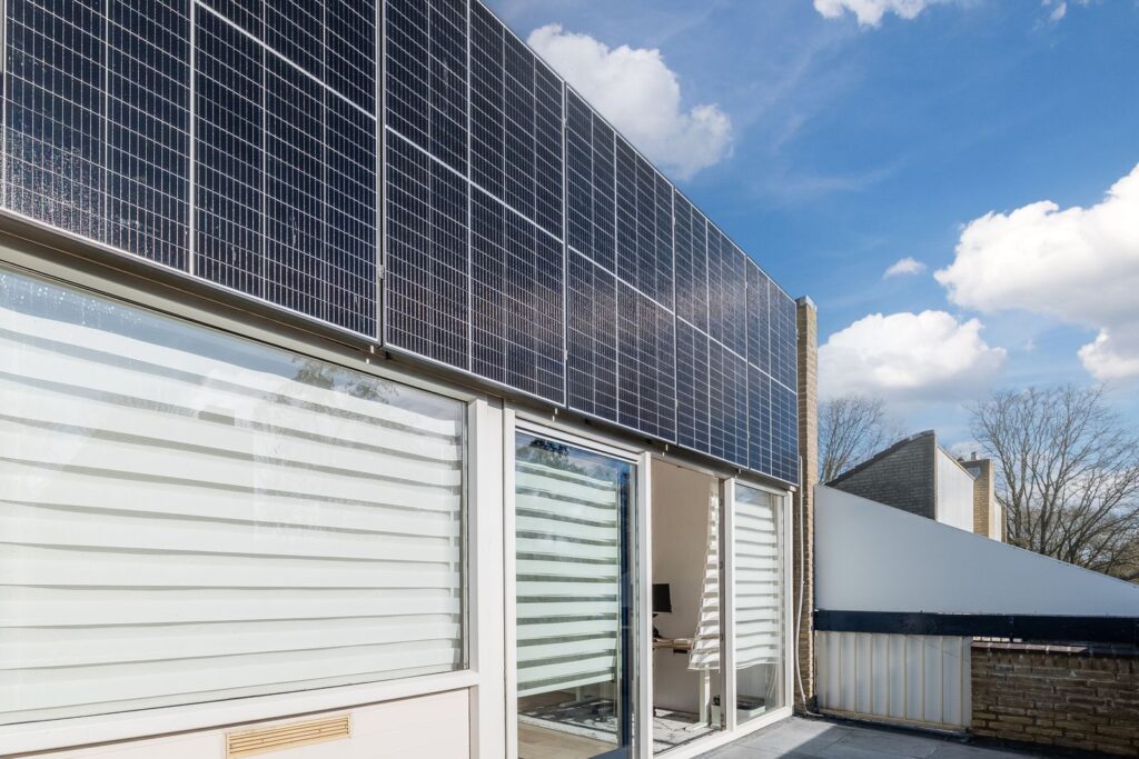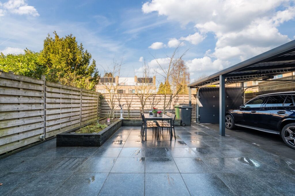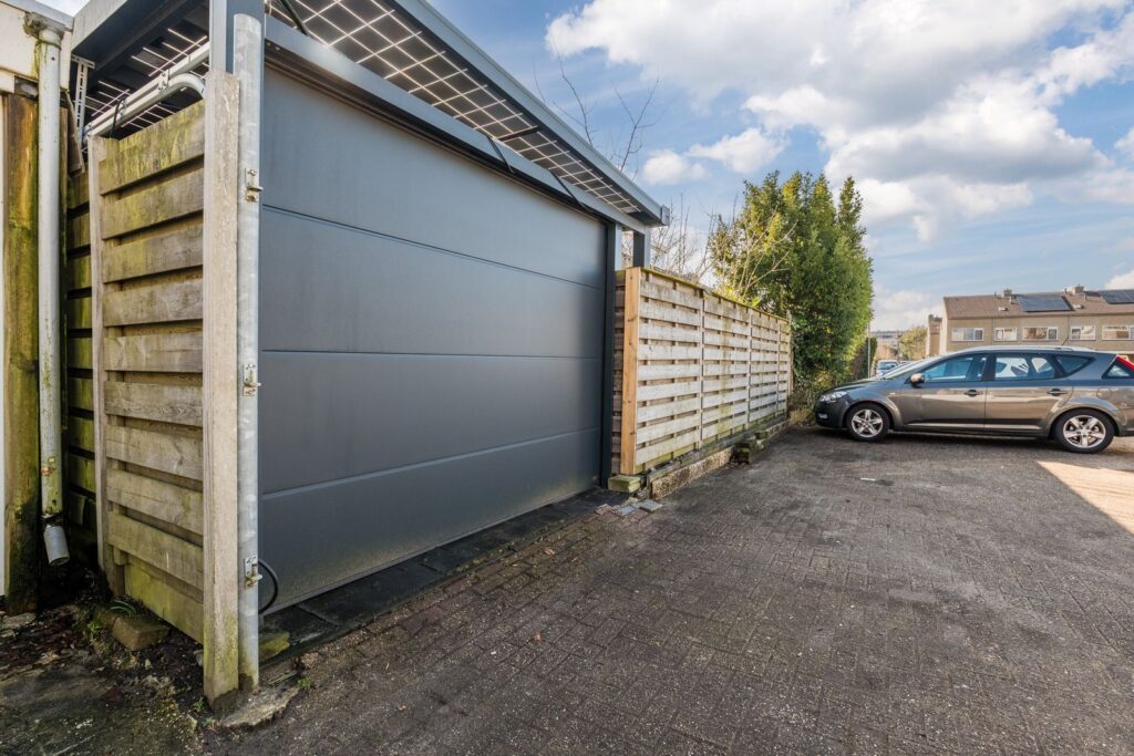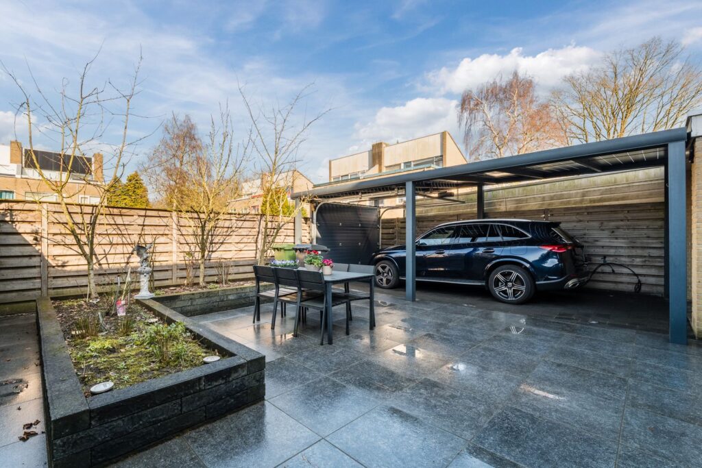 Solar carport met laadpaal en elektrische segmentdeur naar binnenplein.