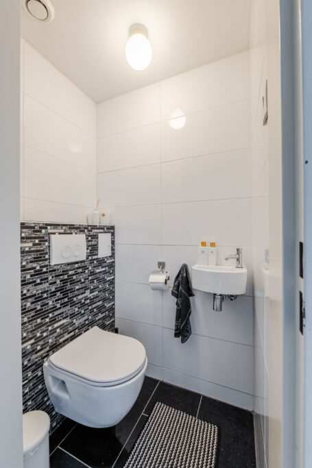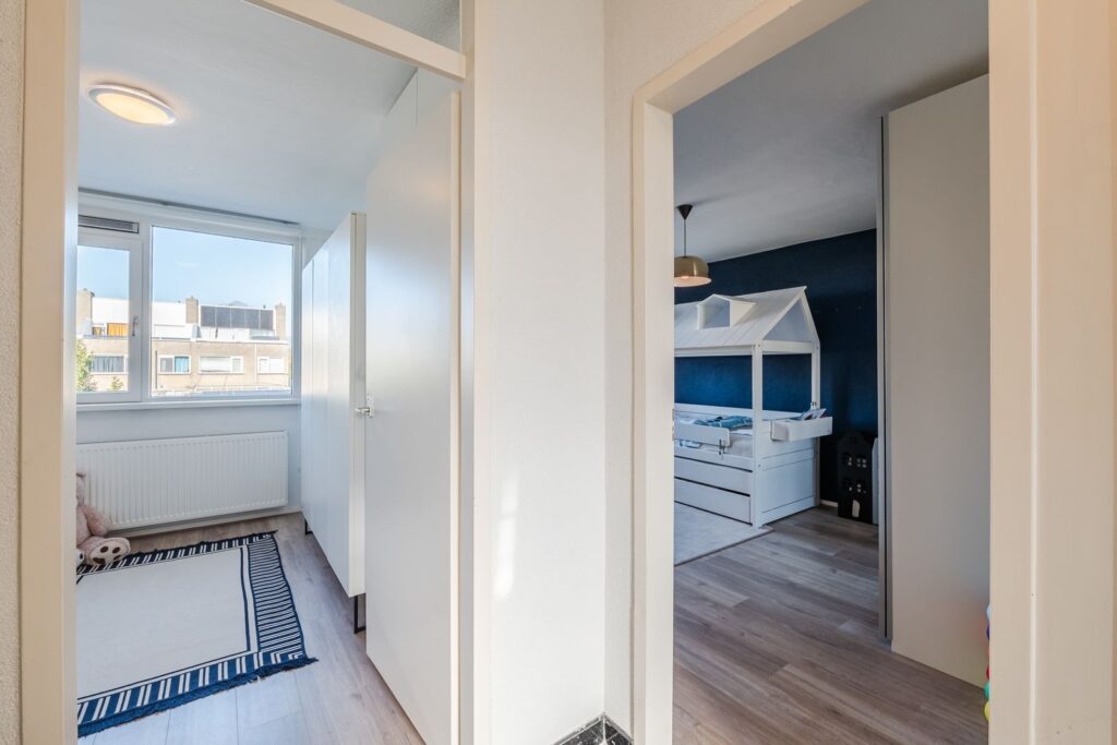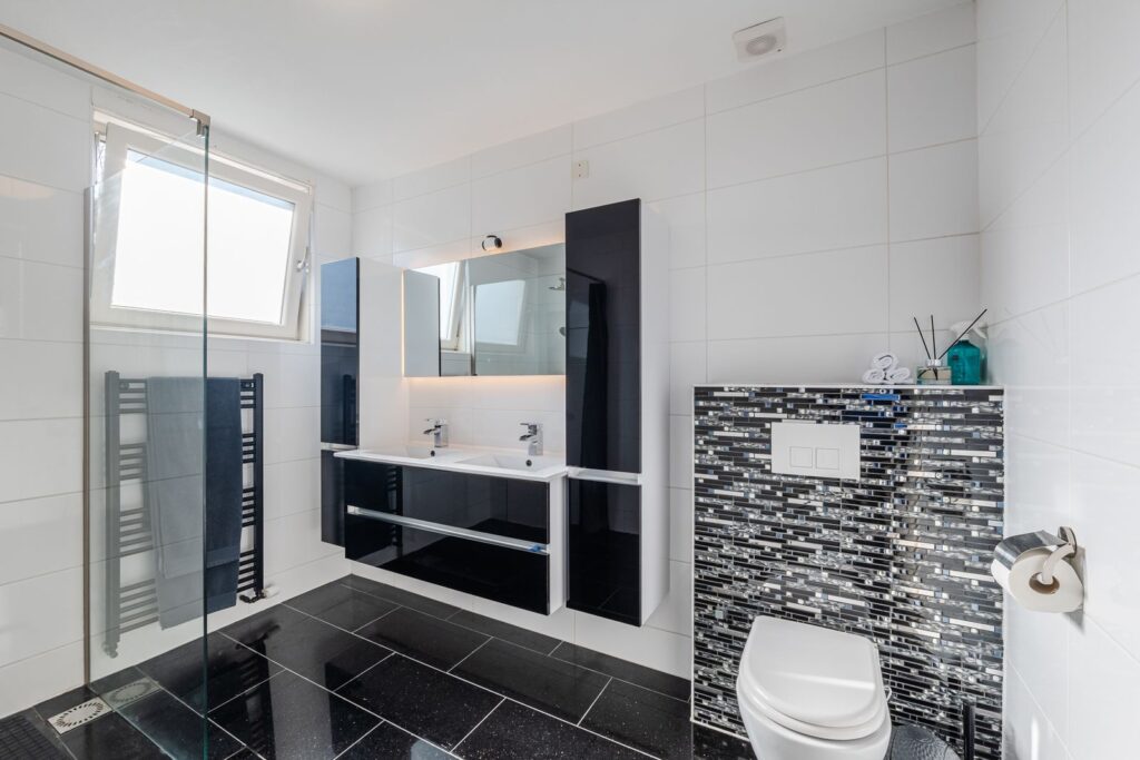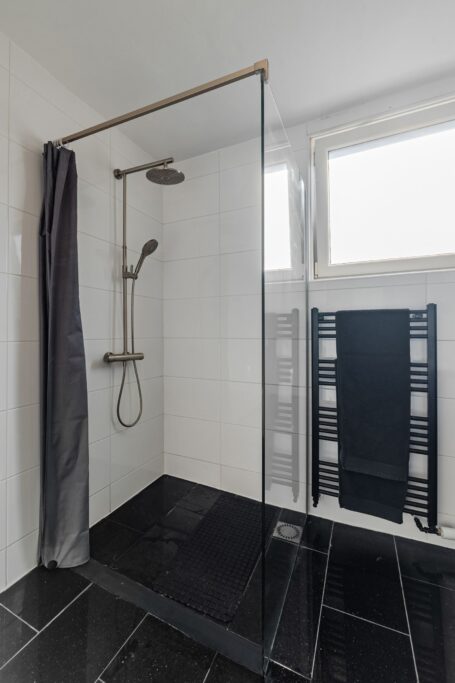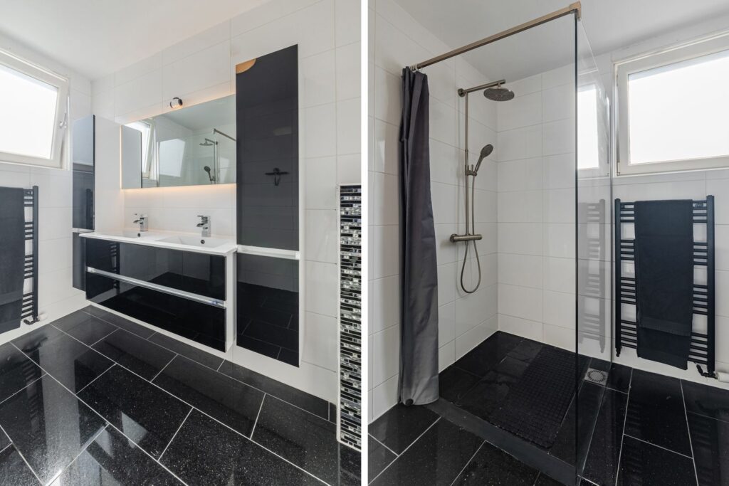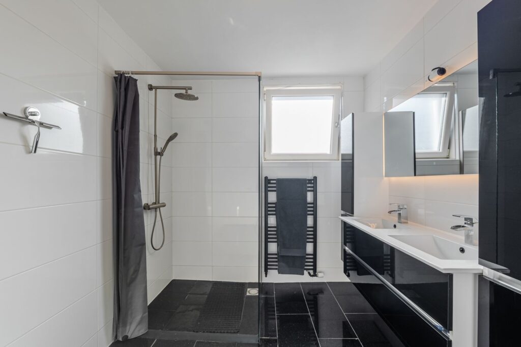 Overloop; 3 ruime slaapkamers allen voorzien van laminaatvloer; keurige badkamer met 2e toilet, dubbele wastafel en recent vernieuwde inloopdouche.