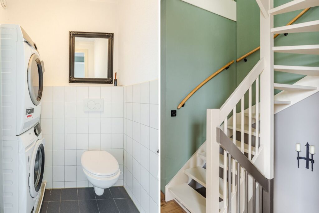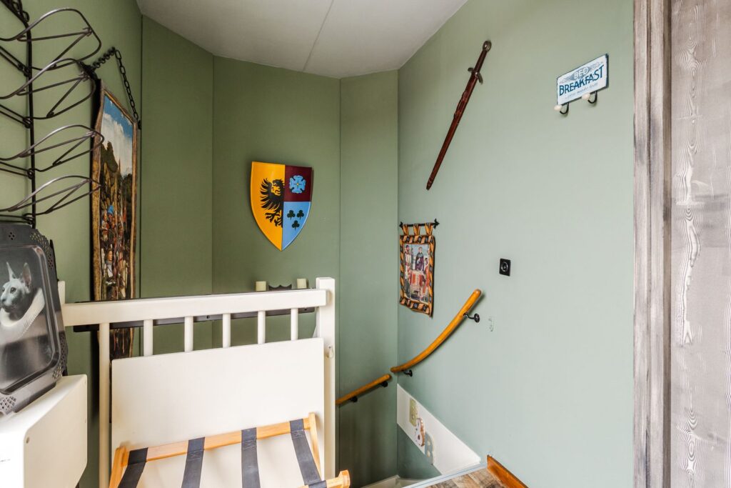 Via een open vaste trap kom je op de zolderetage met ruime overloop en deur naar de torenkamer (momenteel in gebruik als bed & breakfast) met eigen toilet en wasbak en centrale afzuiginstallatie. Via de overloop is er toegang tot het daklandschap.