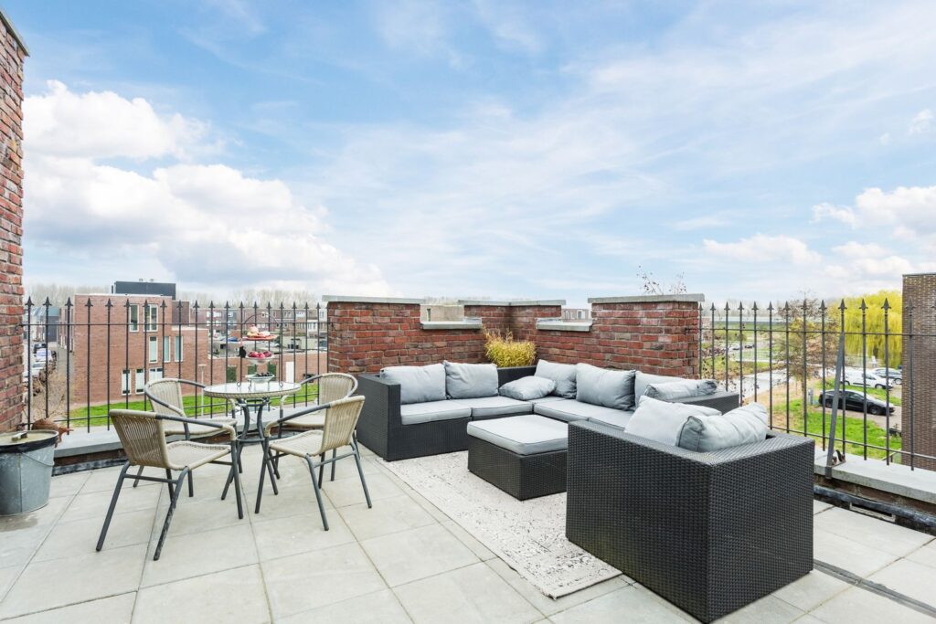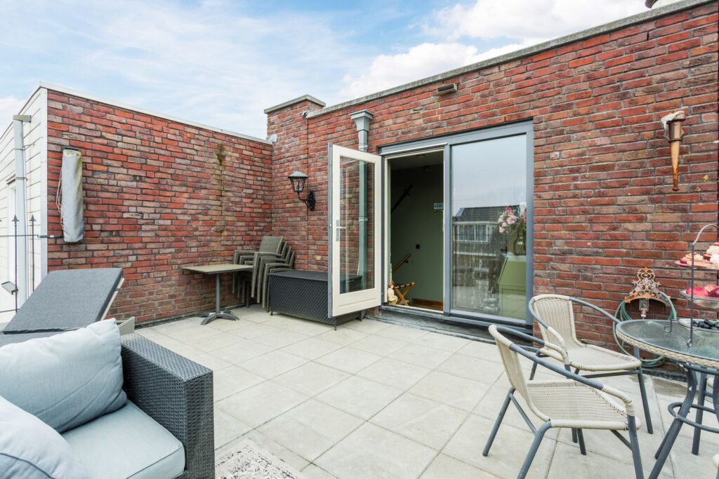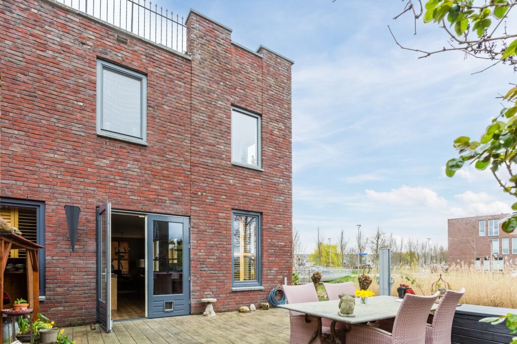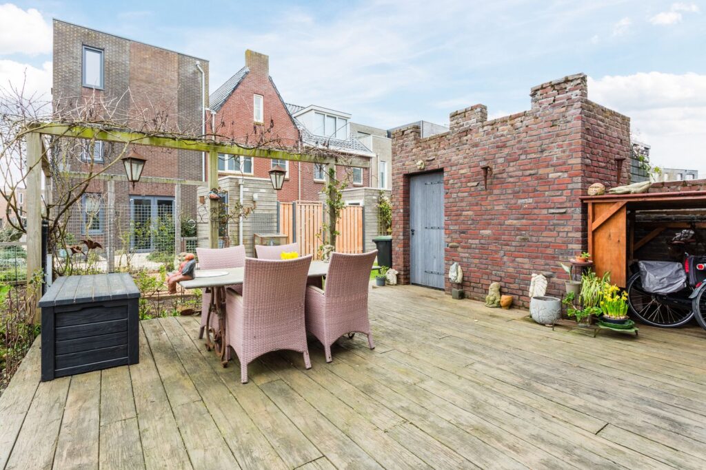 Via de deuren kom je op het terras met de look van een oude houten kasteelvloer maar gemaakt van onderhoudsvrij kunststof. Het terras rust op 8 heipalen. De houten schuur is ommuurd met dezelfde stenen als het hoofdgebouw en heeft ook kantelen. Er is een apart fietsenhok gemaakt naast de schuur. Naast het pand loopt deels in een talud de aangelegde tuin met een lager gelegen houten terras aan het water. Het bovenste terras grenst aan het gemeenschappelijke afgesloten gebied (in VVE uitgegeven) met onder meer een moestuin/bloementuin, grasveldje en een tegelpad naar het openbare terrein.