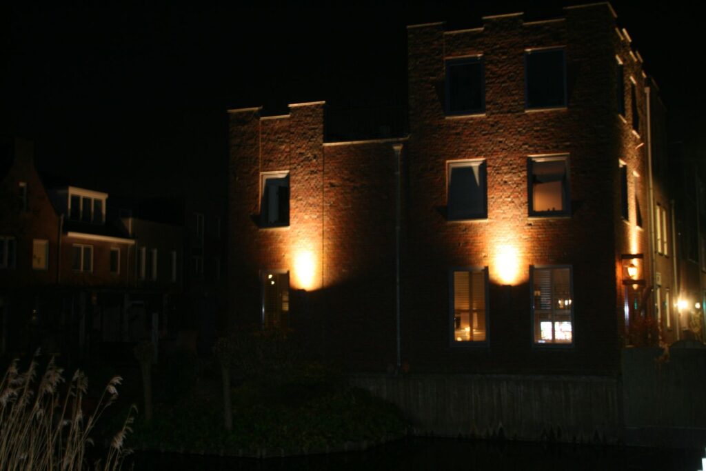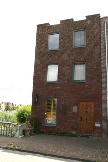 Aan de buitenkant lijkt het nieuwbouwpand uit 2012 een kasteel maar van binnen is het een paleis voorzien van alle moderne gemakken. De voorkant van het huis is 5.40 meter breed en de achterkant is 7.70 meter breed. Op de begane grond (de hoogte is 3.40 meter) liggen plavuizen met de look van een houten vloer, verwarmd door vloerverwarming en een openhaard van cortenstaal met een gasvoorziening. De keuken is van Duitse makelij voorzien van een dikke granieten aanrechtblad met een keukeneiland met diepe lades, een quooker, een combimagnetron die onlangs is vervangen, een Boretti fornuis met inductieplaat en ingebouwde koelkast. Het toilet is in de hal en de trapkast herbergt de vloerverwarmingsinstallatie. Alle ramen zijn voorzien van houten shutters inclusief de openslaande deuren naar de tuin.