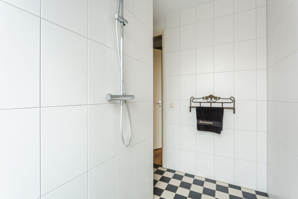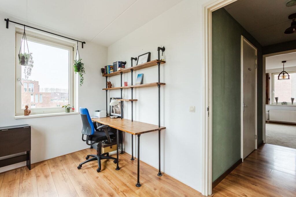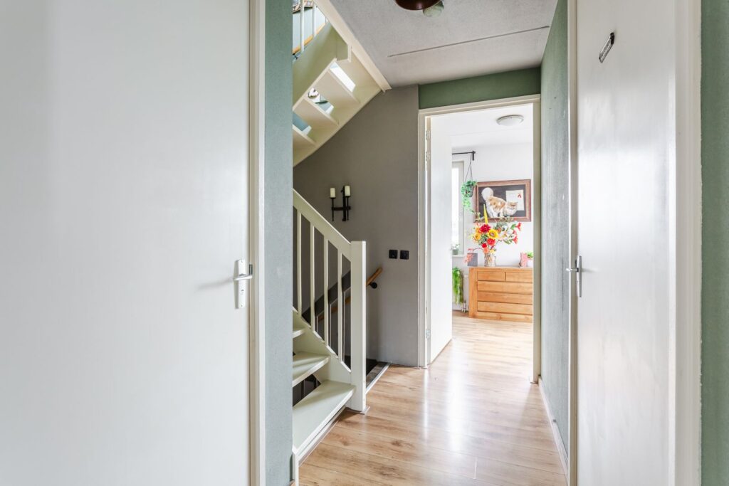 Via de met leer bekleedde trap kom je op de overloop. Net als de studeerkamer is deze voorzien van laminaat. De studeerkamer is een kamer met veel licht aan de voorkant. Via de overloop kom je in de badkamer voorzien van een wastafel met meubel en regendouche met warmte terugwininstallatie en radiator. Er is een schuifdeur naar de ruime ouderslaapkamer met inloopkleedruimte. Onlangs is de vloerbedekking vernieuwd. De slaapkamer en de torenkamer zijn voorzien van houten luiken. Op de overloop is er ook nog een ruime betegelde toilet met aansluiting voor was/droogmachines.