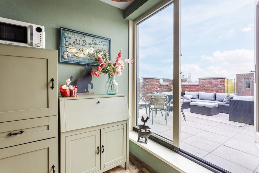 Op het platte dak van de torenkamer liggen 8 zonnepanelen sinds 2019. Het dak en het terras op de 2e etage zijn voorzien van kantelen.