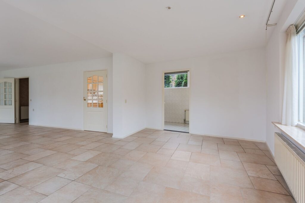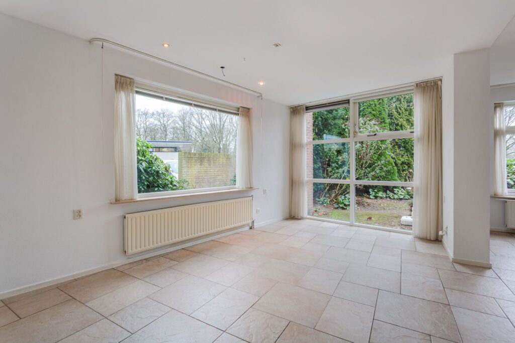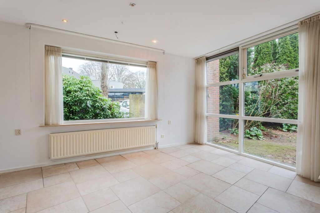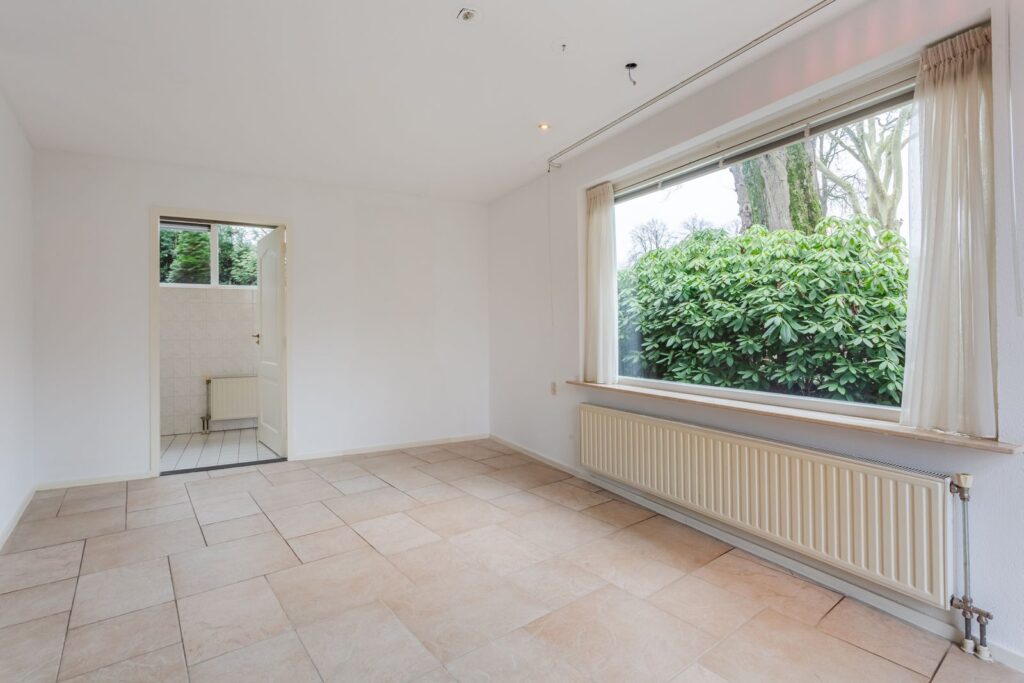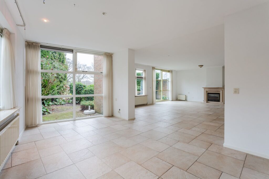 Via de deur met mooi geslepen ruiten komt u in de woonkamer. Deze is ruim en licht door de vele ramen en schuifpui aan de achterzijde. De karakteristieke marmeren schouw met gashaard is een sfeervolle en bijzondere blikvanger die de ruimte bovendien snel een aangename warmte geeft. De open en suite eetkamer, aansluitend aan de woonkamer, is tevens voorzien van een grote raampartij met glas tot op de vloer en een groot zijraam waardoor het geheel een open licht karakter heeft. De woon en eetkamer zijn net als de rest van het huis voorzien van radiatoren. De schuifpui biedt toegang tot het terras en de onderhoudsarme tuin en aan deze zijde van de woning heeft u een fraai uitzicht op een grote grasweide en oude bomenrijen. De eetkamer is groot genoeg om er een (slaap)kamer van te maken, zodat de woning levensloop bestendig is. De beneden gelegen badkamer is immers aansluitend aan de huidige eetkamer gesitueerd. Deze badkamer is voorzien van een wastafel met wastafelmeubilair, toilet, douche, radiator, mechanische ventilatie en bovenramen.