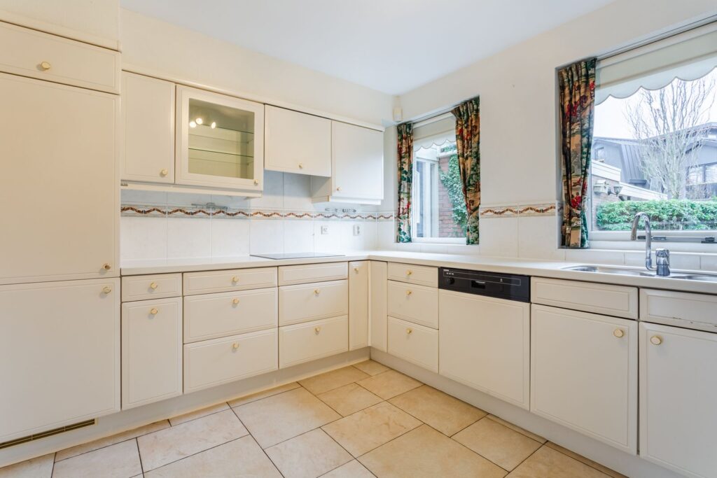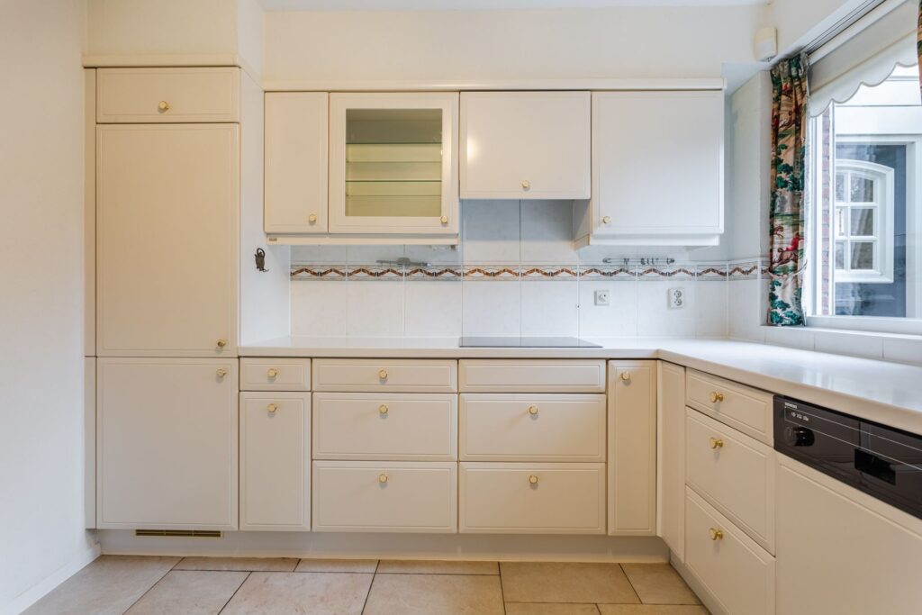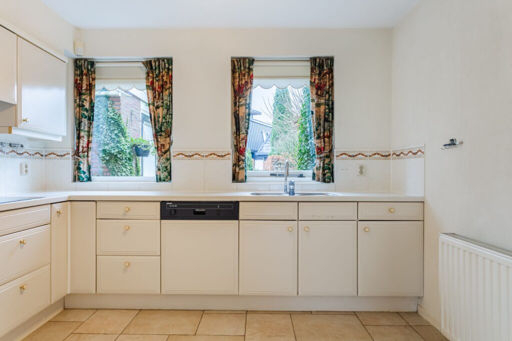 Vanuit de woonkamer komt u in de gezellige keuken met L-vormige opstelling. De keuken is voorzien van een inductiekookplaat, afwasmachine en koelkast en kijkt leuk uit op de voordeur en voortuin en is groot genoeg voor een eettafel voor minstens 3 personen. De keuken biedt veel bergruimte met in de bovenkastjes een afzuiginstallatie.