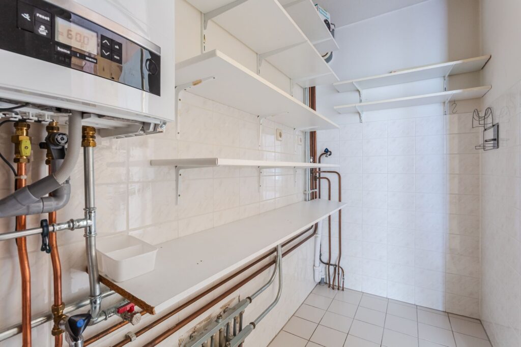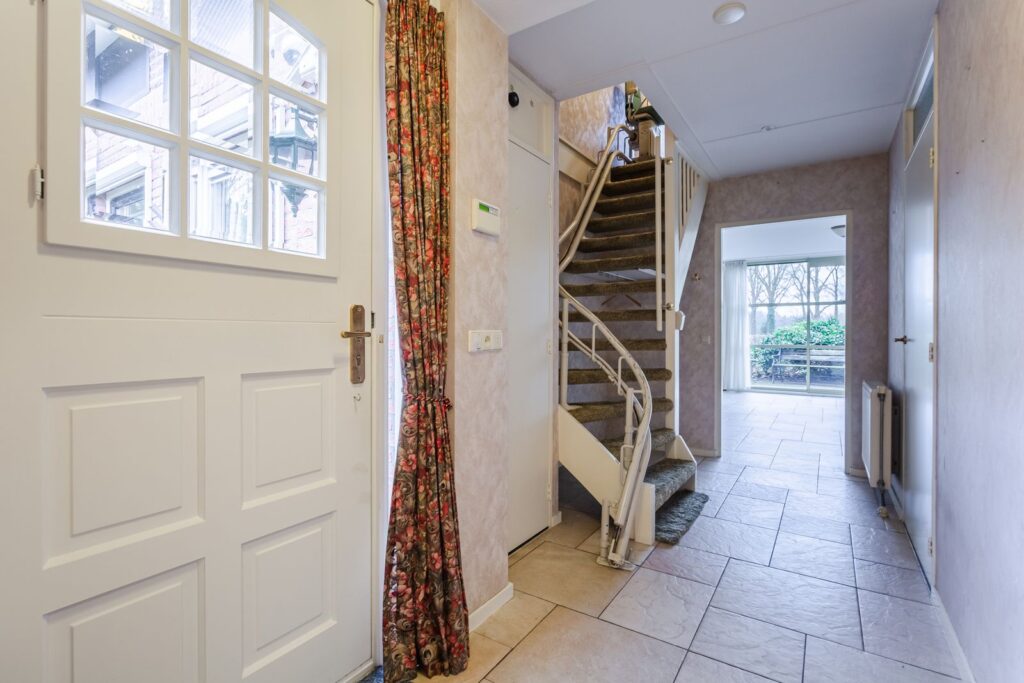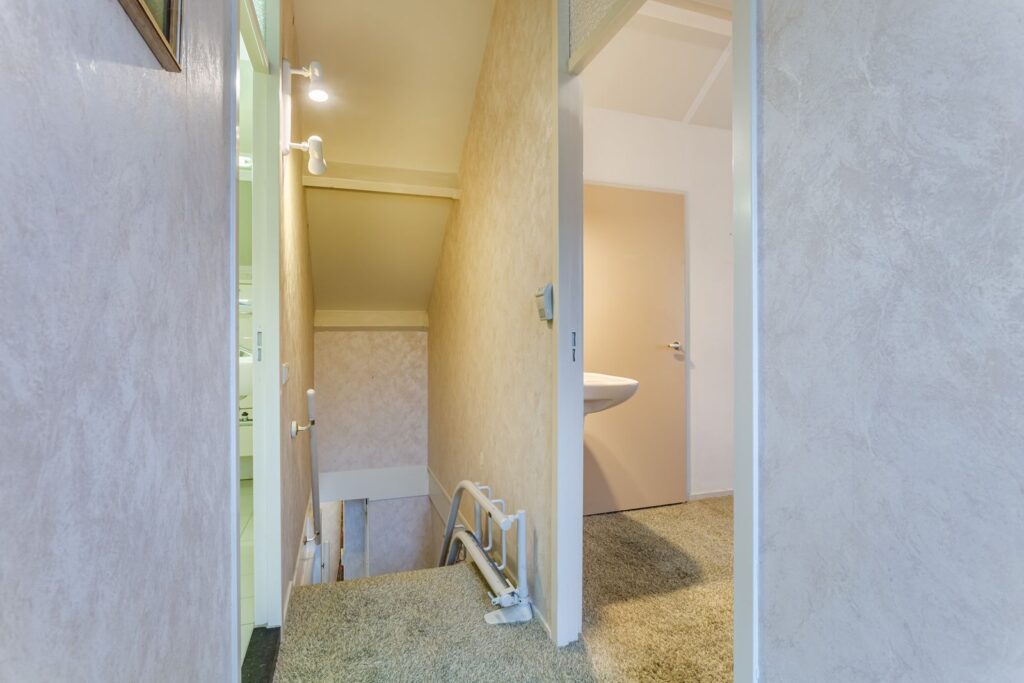 Bij binnenkomst via de fraaie voordeur in de hal, bereikt u niet alleen de garage, maar ook het toilet, de ruime bijkeuken met; CV installatie uit 2022, een wasmachine/ droger aansluitingen en voldoende bergruimte. Hier bevindt zich tevens de trap, voorzien van een elektrische stoellift, naar de bovenverdieping.