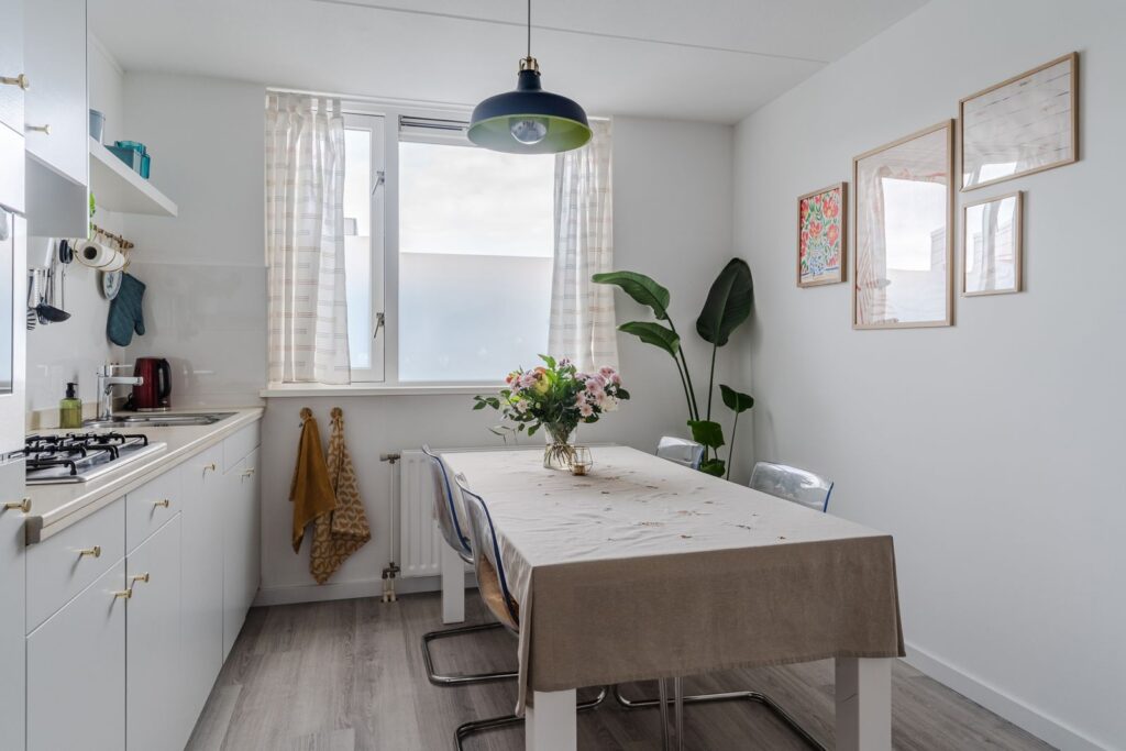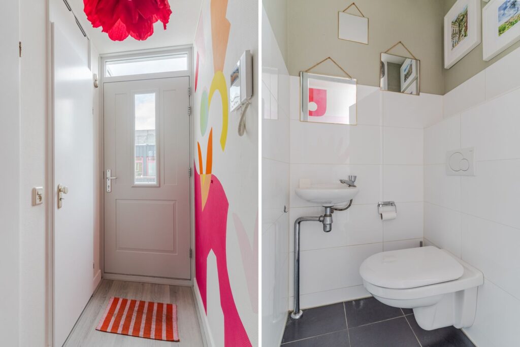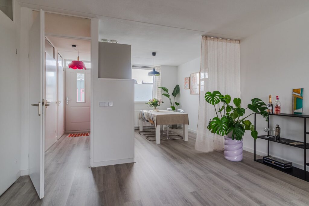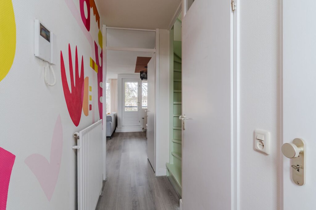 Bij binnenkomst in de hal vind je de meterkast en een separate toiletruimte. Vanuit hier loop je door naar de woonkamer. Deze leefruimte is opvallend licht door de ramen aan twee zijden en biedt voldoende plek voor zowel een comfortabele zithoek als een ruime eettafel. Vanuit de woonkamer heb je toegang tot het balkon met uitzicht op het groen.
