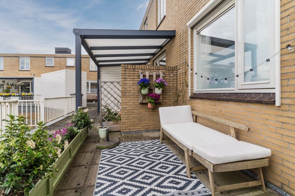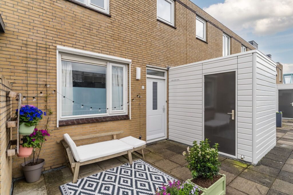 De woning beschikt over twee fijne buitenplekken. Aan de woonkamer ligt een balkon waar je rustig kunt zitten, terwijl bij de entree een zonnig terras op het westen ligt. Hier geniet je van de middag- en avondzon.