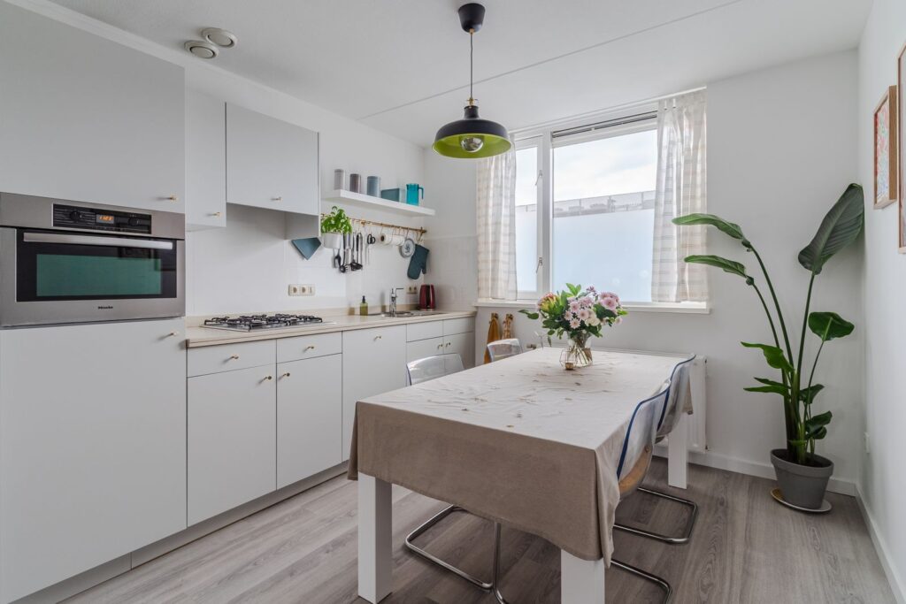 De halfopen keuken sluit mooi aan op de woonkamer en is praktisch ingericht met een rechte opstelling en diverse inbouwapparatuur zoals een vaatwasser en combi oven-magnetron. Het keukenraam is voorzien van een screen dat de zon op zomerse dagen effectief buiten houdt.