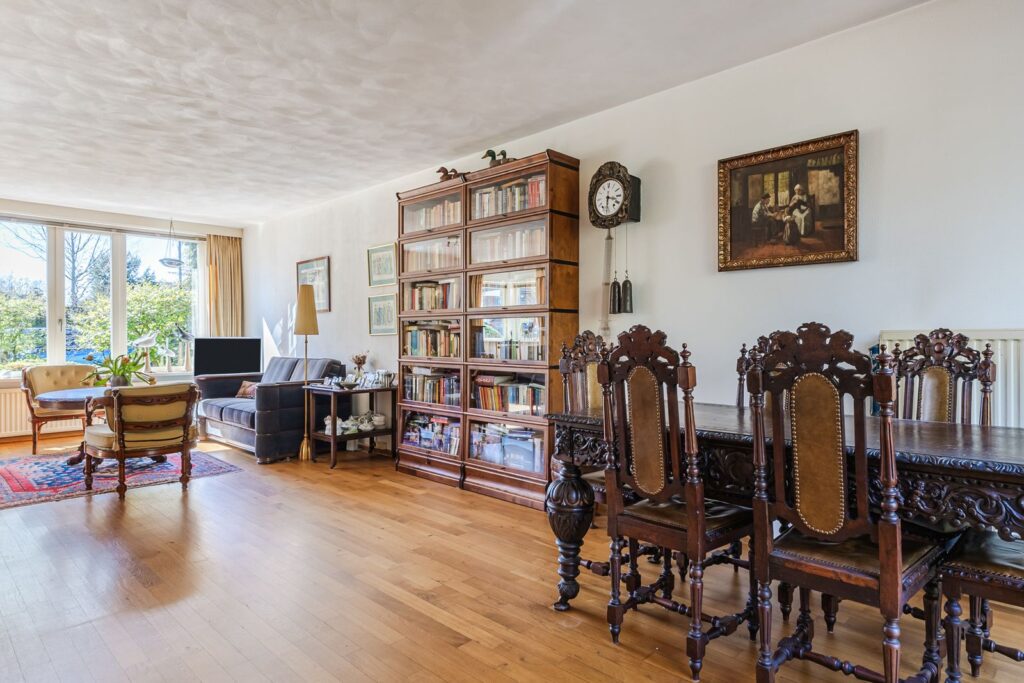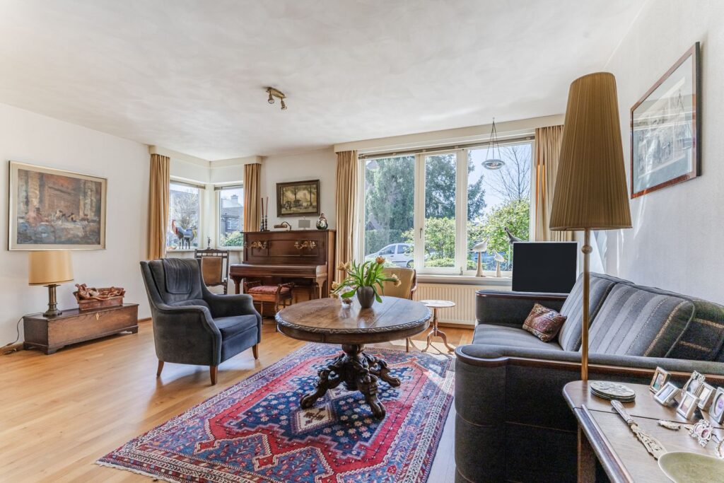 Ruime L-vormige woonkamer (ca 40 m2) met openslaande deuren naar terras en tuin. De grote ramen zorgen voor veel lichtinval. De woonkamer is voorzien van een massieve eikenhouten parketvloer. Halfopen hoekopgestelde keukeninrichting voorzien van gaskookplaat, afzuigkap en koelkast.