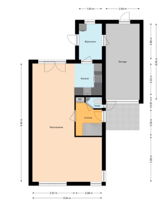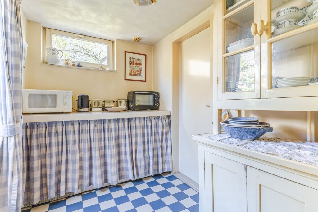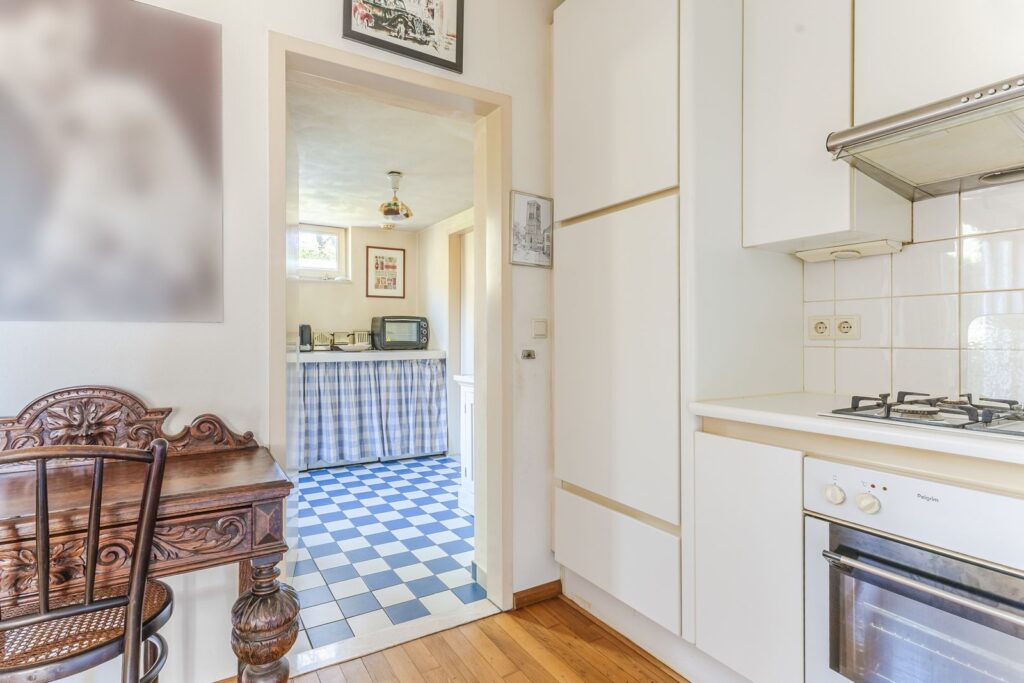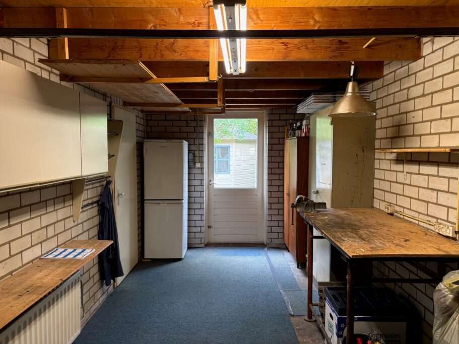Bijkeuken met wasmachineaansluiting en toegangsdeur tot garage en tuin. De bijkeuken is uitgevoerd in spouwmuren, geïsoleerd en voorzien van verwarming.