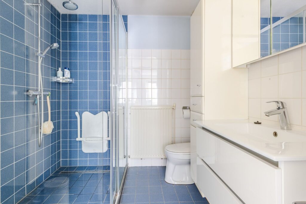 Badkamer met inloopdouche, vaste wastafel en tweede toilet.