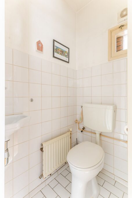 Overdekte entree. Hal met trapopgang, toilet met fonteintje en meterkast.