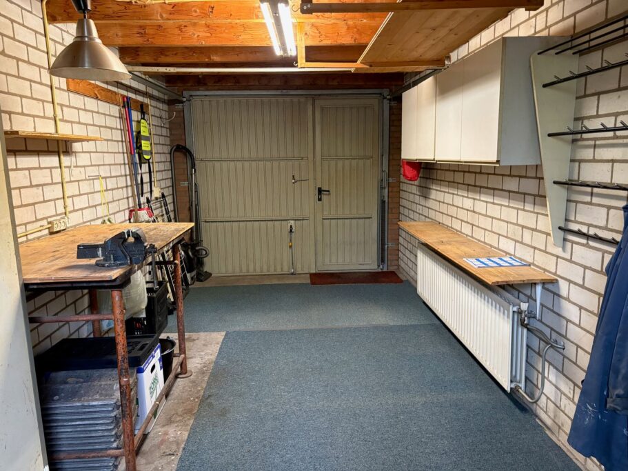 De garage is opgetrokken in spouwmuren en voorzien van dubbel glas, isolatie en verwarming. Dit biedt mogelijkheden om de garage bij de woonruimte te betrekken. Ook boven de garage is er mogelijkheid tot aanbouw van een extra (slaap)kamer.