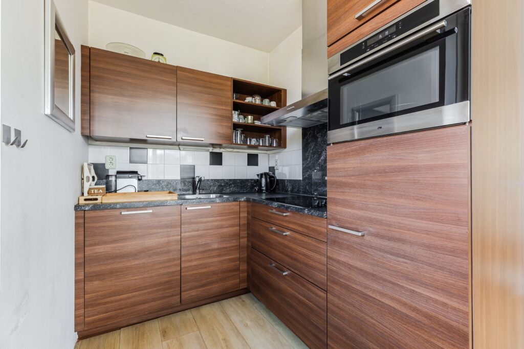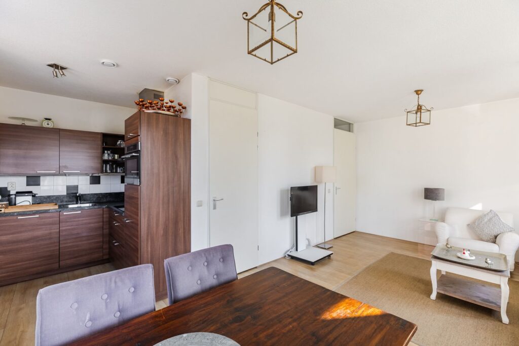 De lichte woonkamer biedt toegang tot het balkon gelegen op het westen en de keuken. De open keuken is voorzien van een koelkast, vaatwasser, combi-oven, 4-pits inductiekookplaat en afzuigkap.