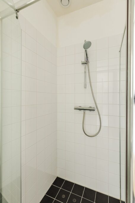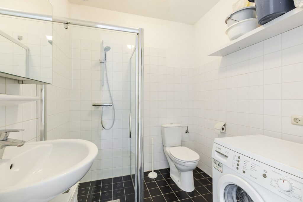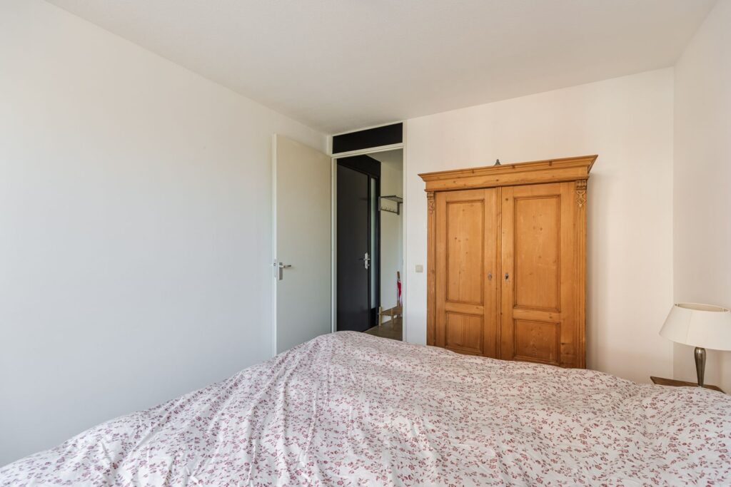 De slaapkamer is aan de zijkant van het pand gelegen en is voorzien van een 2-persoons bed en een ruime kledingkast. De badkamer beschikt over een douchecabine, wastafelmeubel en toilet.