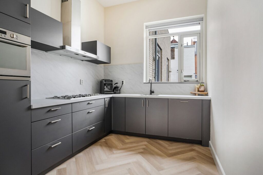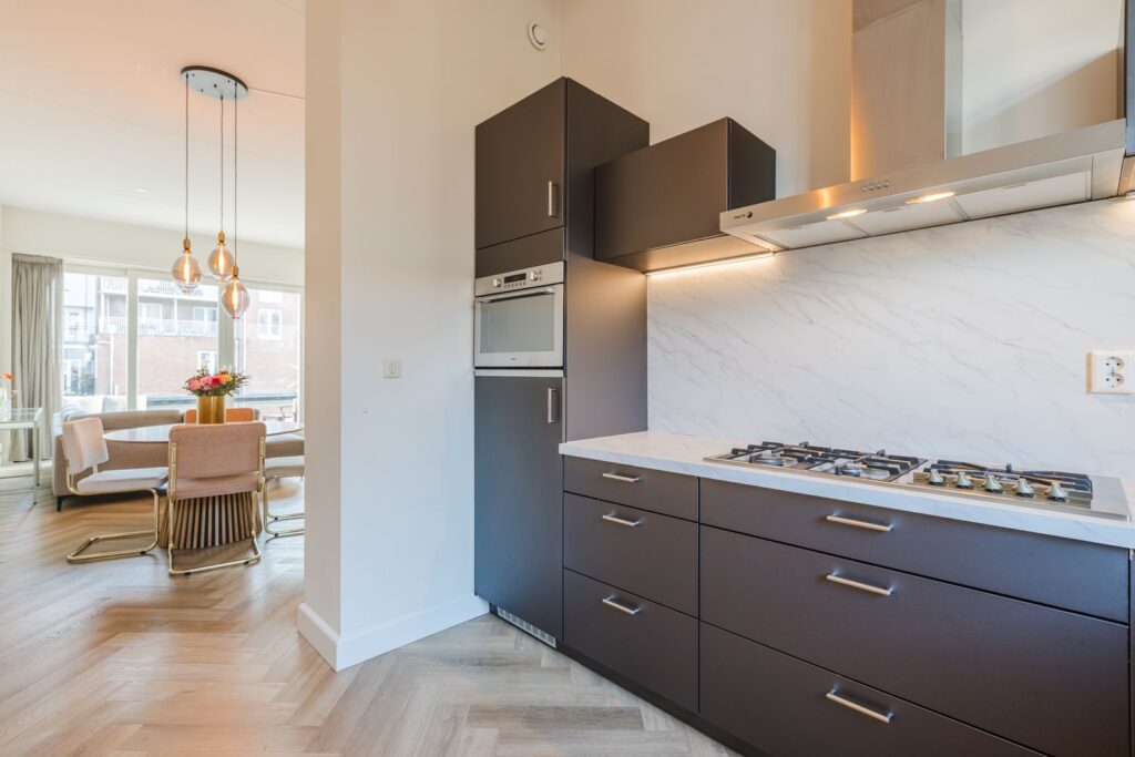 De woonkamer staat bovendien in directe verbinding met de open keuken. De keuken is uitgevoerd in een L-vorm en uitgerust met diverse inbouwapparatuur en 5-pits gasfornuis. De keuken is licht en biedt volop werk- en kastruimte.