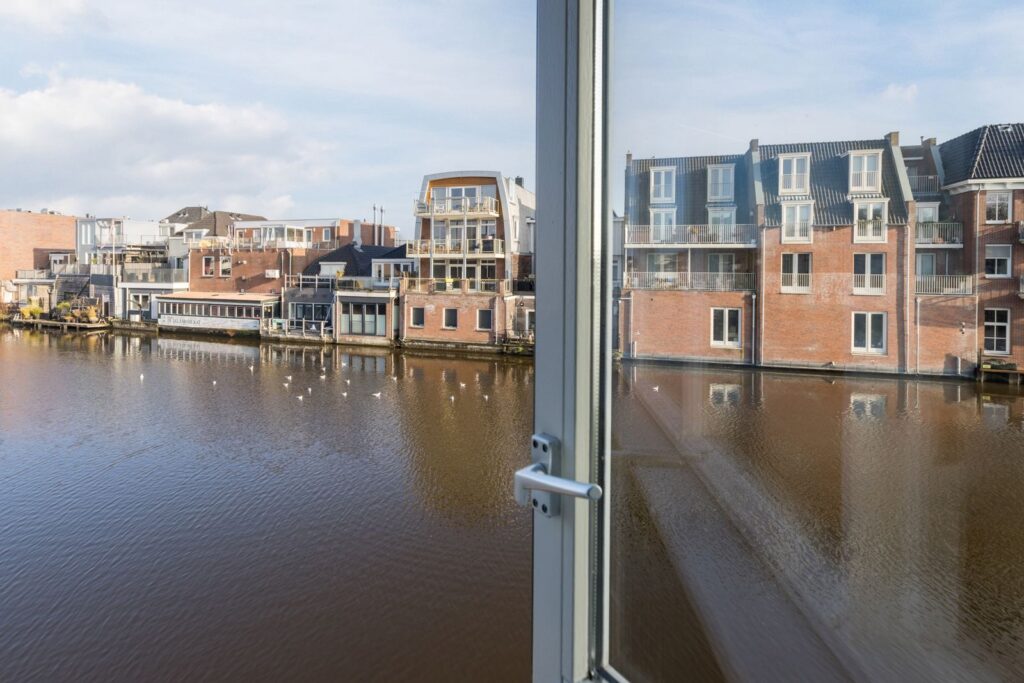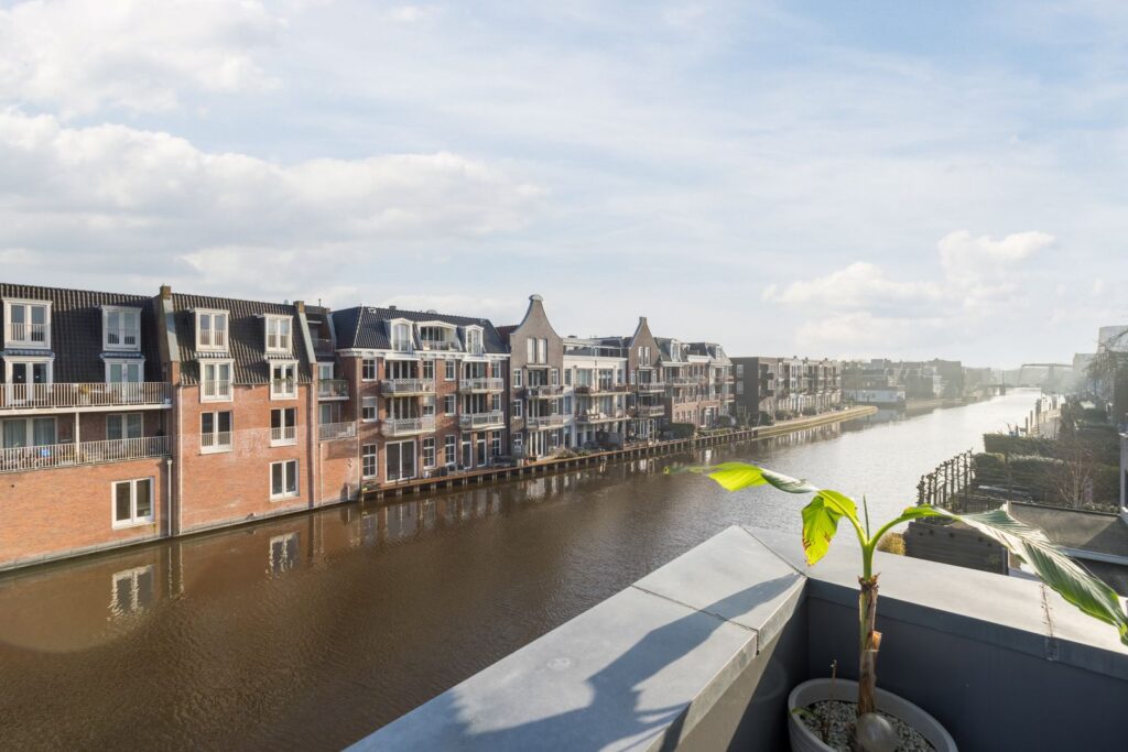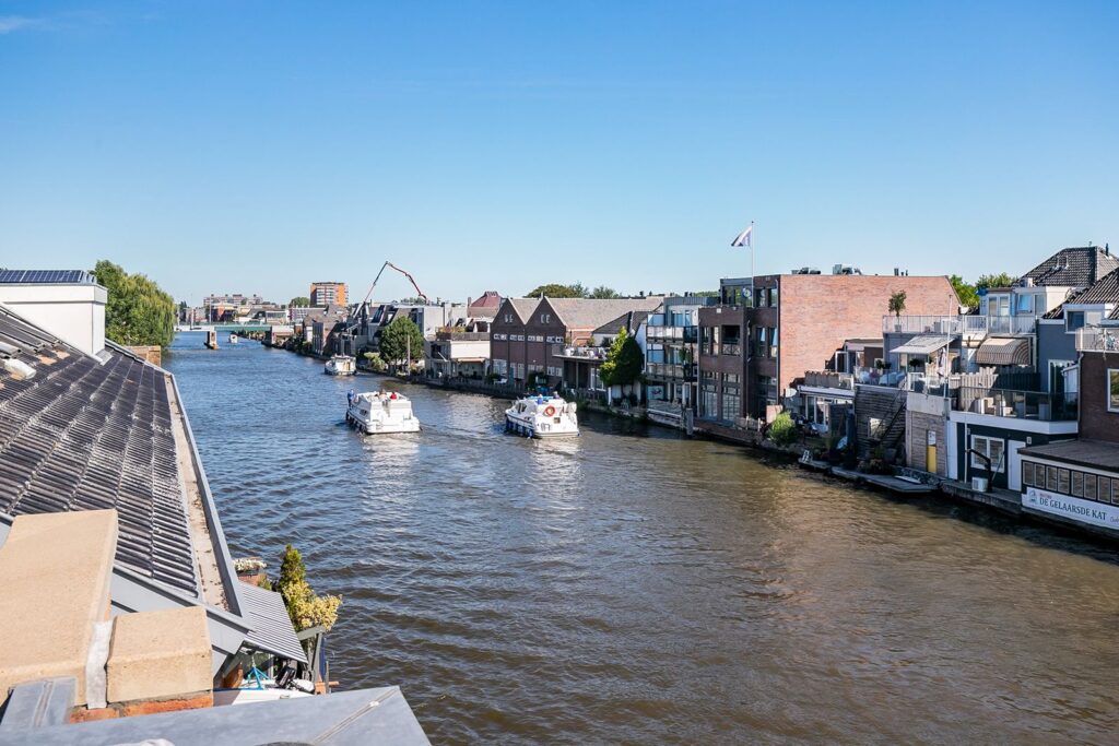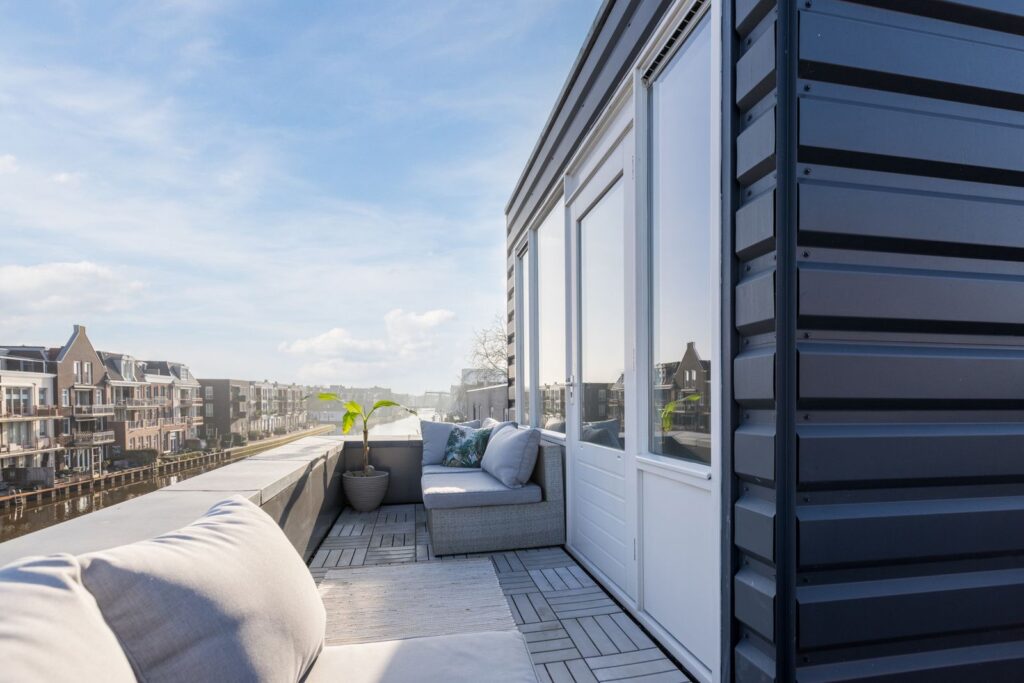 De slaapkamer aan de achterzijde van het huis heeft uitzicht over de Oude Rijn. Via een deur naar buiten betreedt u de derde unieke buitenruimte: een dakterras met weids uitzicht over het water, de koningin Julianabrug en de Alphensebrug. Door de hoge ligging van dit terras kunt u hier ook genieten van middag- en avondzon.