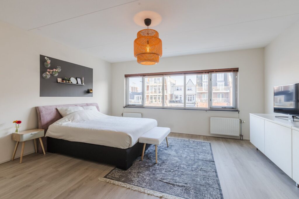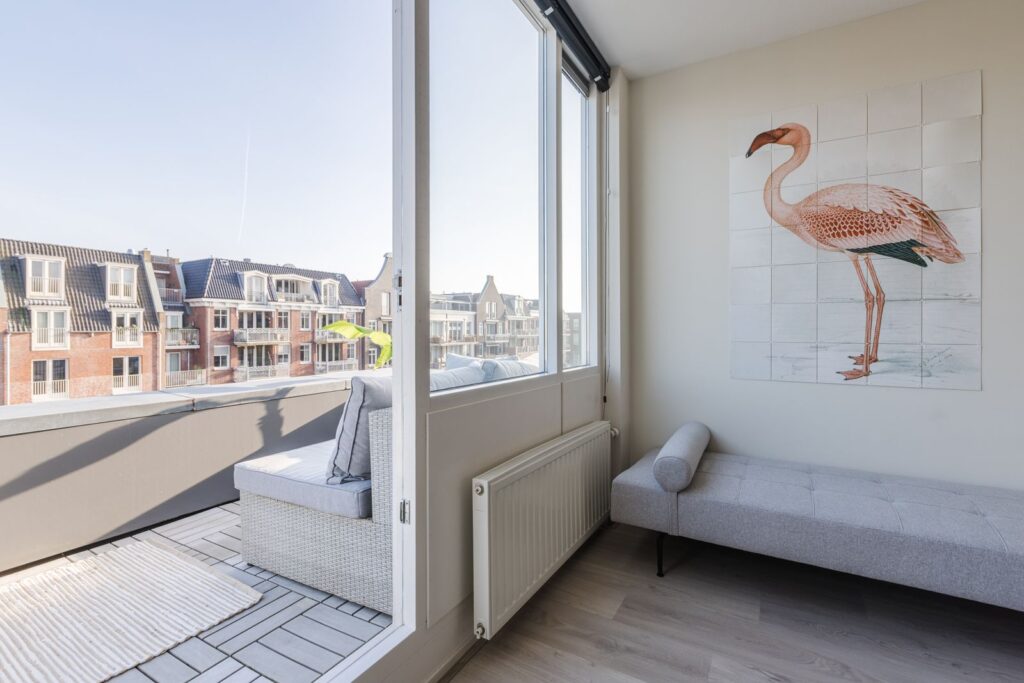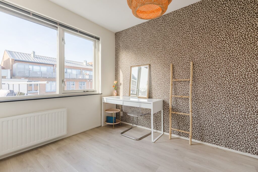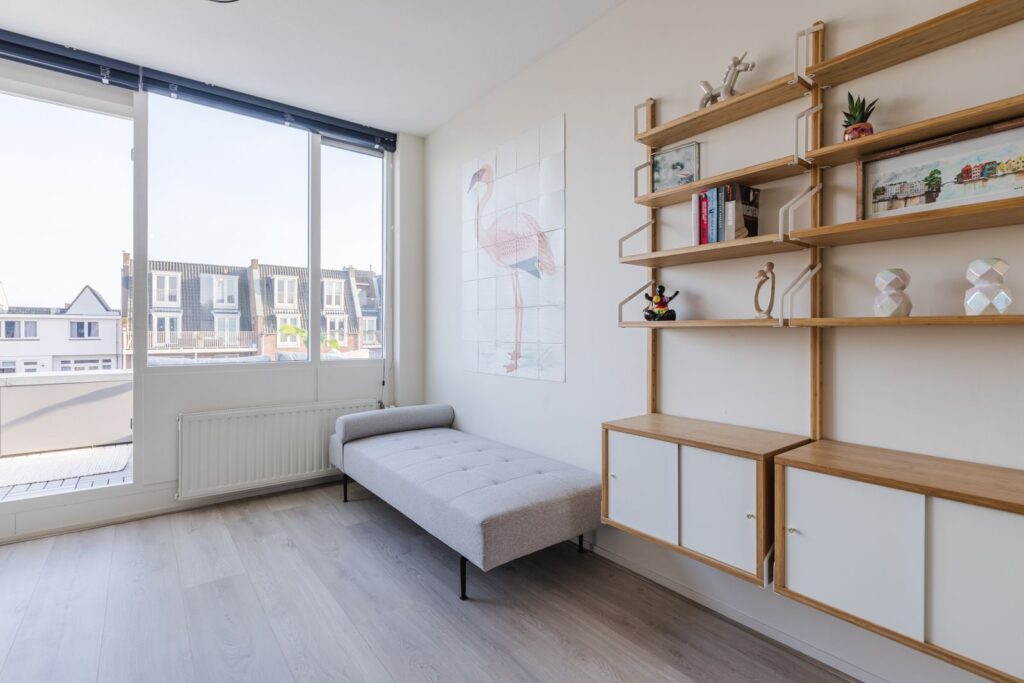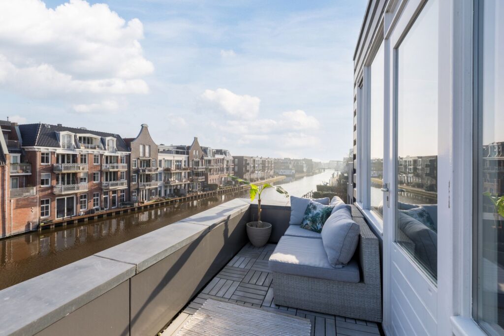 De slaapkamer aan de achterzijde van het huis heeft uitzicht over de Oude Rijn. Via een deur naar buiten betreedt u de derde unieke buitenruimte: een dakterras met weids uitzicht over het water, de koningin Julianabrug en de Alphensebrug. Door de hoge ligging van dit terras kunt u hier ook genieten van middag- en avondzon.