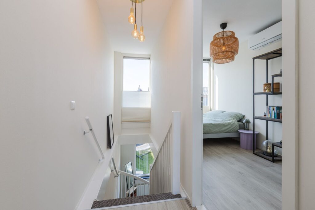 Met de open trap bereikt u de overloop van de tweede verdieping. Dankzij de lichtkoepel en het grote raam is deze verdieping opvallend licht en prettig. De overloop biedt toegang tot nog eens twee ruime slaapkamers. Beide slaapkamers hebben een grote raampartij en zijn voorzien van airconditioning.