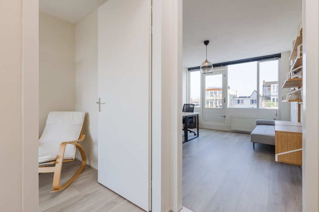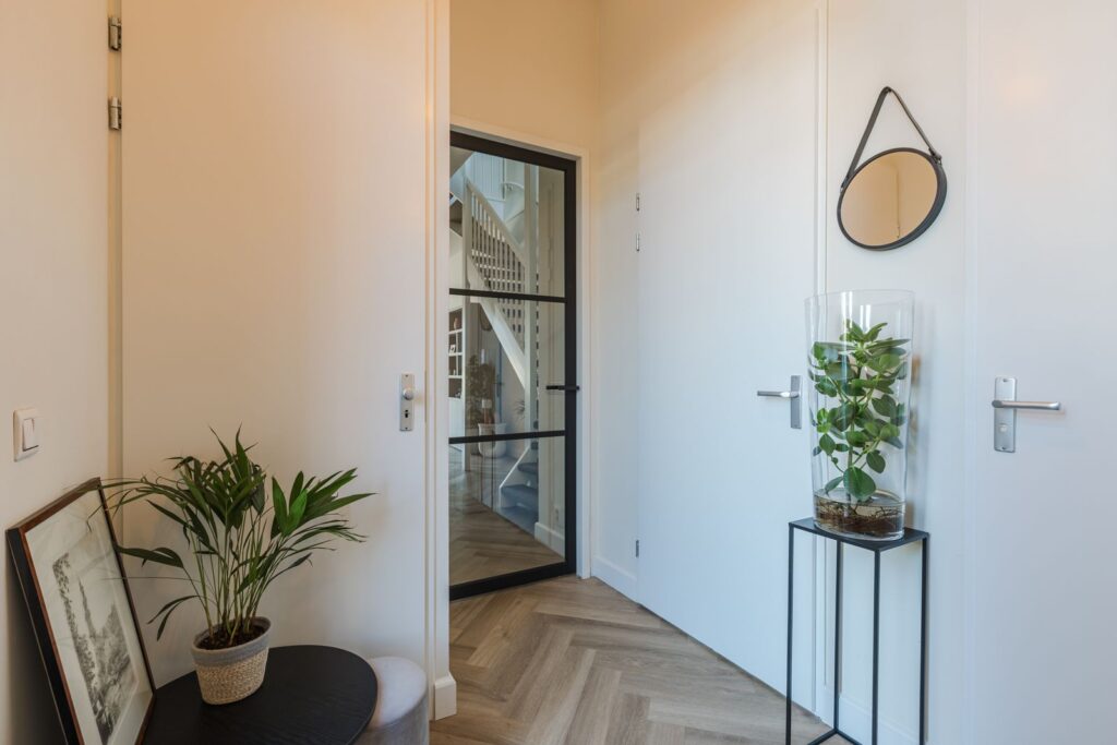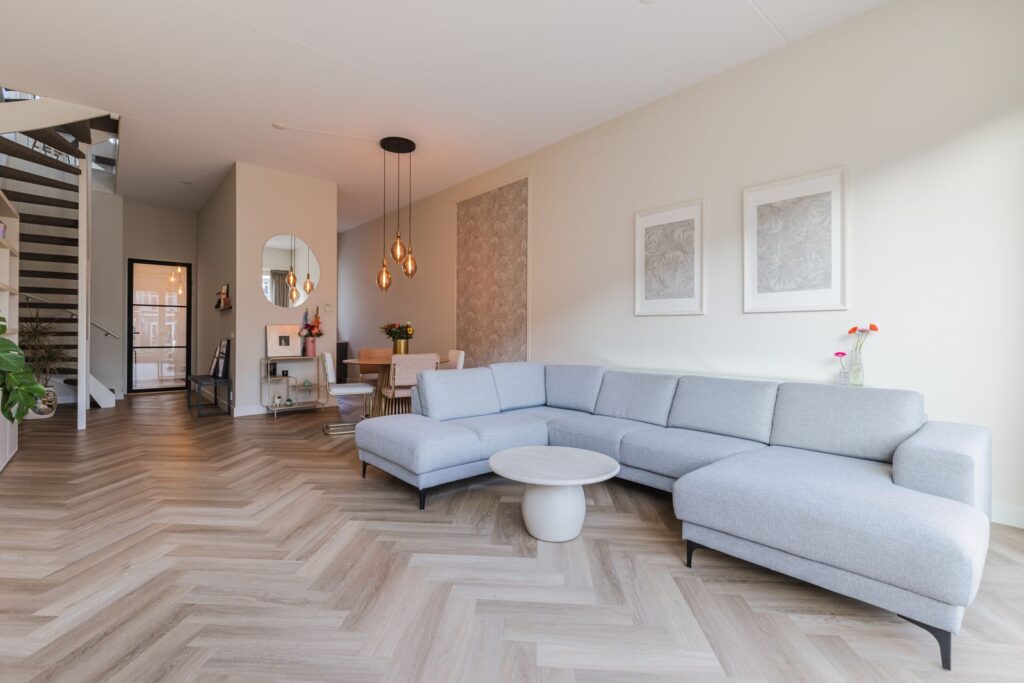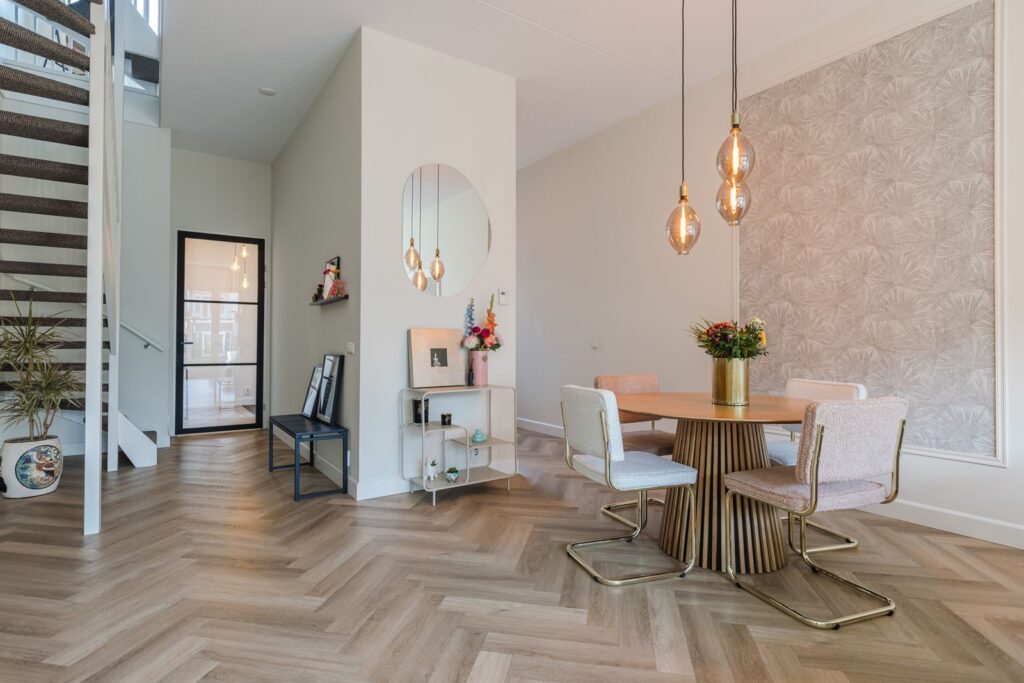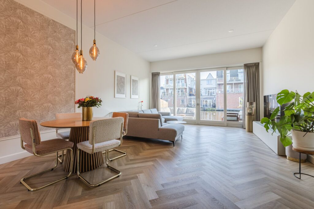 De woonkamer kenmerkt zich door veel licht en ruimte: de hoge plafonds in combinatie met de grote raampartijen zorgen voor een ruimtelijk gevoel en een prachtige lichtinval. De visgraatvloer, hoge plinten en strakke wanden geven de woonkamer een stijlvolle en moderne uitstraling. Daarbij zorgt het vrije uitzicht over de Oude Rijn voor een unieke woonbeleving die nooit verveelt.
