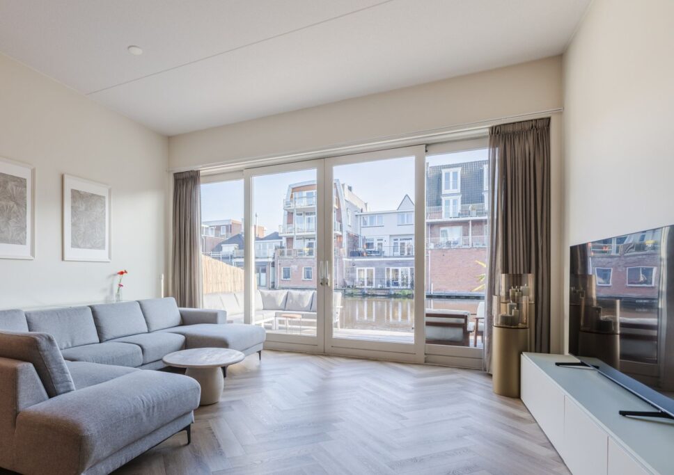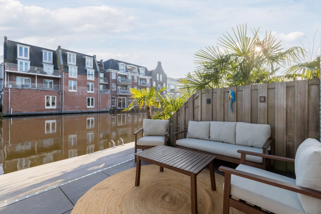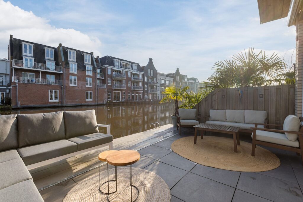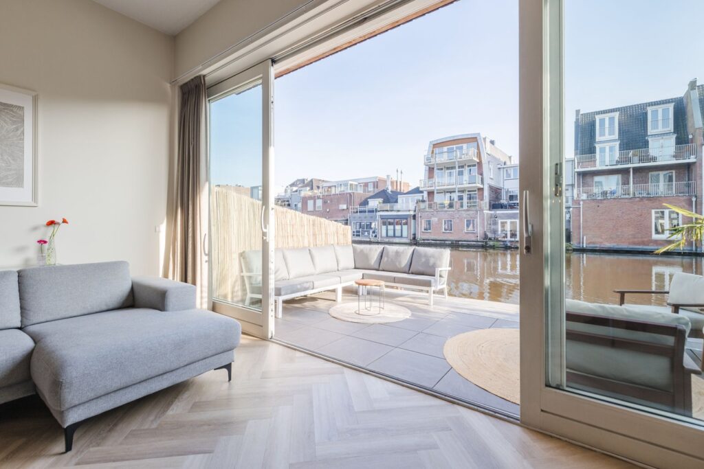 De grote dubbele schuifdeuren verbinden de woonkamer op natuurlijke wijze met het terras aan de Oude Rijn en laten binnen en buiten naadloos in elkaar overlopen. Het terras van circa 21 m² biedt ruimte voor meerdere zit- en loungesets. Hier geniet u in de zomer volop van de zon, het water en de voorbijvarende pleziervaart. Dankzij de grote schuifdeuren en het elektrische zonnescherm voelt het terras in de zomer als een verlengstuk van de woonkamer.